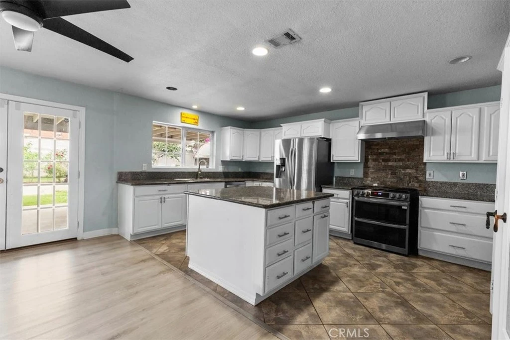 Tucked away on a quiet cul-de-sac in a desirable residential neighborhood, this 3-bedroom, 2-bath home offers a great opportunity with solid features and added improvements throughout. The living room showcases a beautiful stone fireplace, while the kitchen offers a functional layout with a spacious island, ideal for everyday living and entertaining. The home features an open layout, recessed lighting, and a mix of upgraded elements that provide a strong foundation for a buyer to make it their own. Recent exterior improvements include a rebuilt patio roof and upgraded rain gutters (2024), along with a permitted privacy wall added in 2023. A custom wooden gate separates the backyard into two distinct areas, offering added flexibility and use of space. The backyard is spacious with a covered patio, perfect for outdoor use and entertaining. With its location, layout, and added features, this home presents a fantastic opportunity for buyers looking to personalize and add value.
