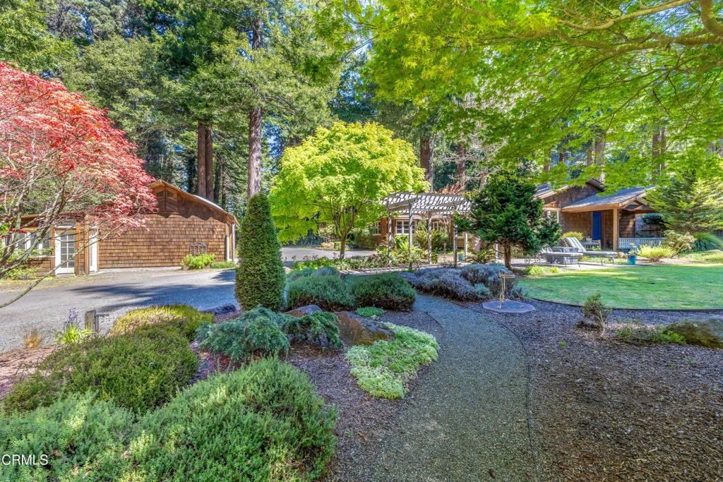 Tucked behind a private, automatic gated entry and fully fenced for ultimate seclusion, this extraordinary property unfolds like your own personal botanical sanctuary where the noise of the outside world fades and nature takes center stage. Just minutes from town and the coastline, it offers a rare balance of peaceful country living with effortless access to coastal amenities.Set within a park-like landscape of meticulously trimmed, towering redwoods that filter sunlight beautifully throughout the grounds, the custom-built home is warm, inviting, and rich with character. Inside, vaulted old-growth redwood ceilings, custom woodworking, and thoughtfully placed windows create a seamless connection between indoor comfort and the surrounding natural beauty. Warm tile flooring flows through the main living areas, anchored by a wood-burning fireplace and complemented by a sun-drenched solarium, perfect for year-round relaxation.The primary suite offers a peaceful retreat with an additional loft space ideal for guest accommodations, while both bedrooms feature large, redwood-trimmed windows that invite the outdoors in. Custom cabinetry enhances both form and function throughout the home. Designed for both wellness and creativity, the property features a private hot tub and sauna, along with a truly one-of-a-kind guest experience--a custom-crafted studio built from a converted water tank. This artistic space offers incredible flexibility as guest quarters, a vacation rental, or a private creative retreat, complete with its own deck for enjoying sunny afternoons or listening to coastal rain against the skylights. The newly finished garage expands the usability of the property with two private workshop spaces ideal for a home gym, studio, or hobby space, along with extended enclosed storage for bikes, tools, and coastal gear. A large water storage system and irrigation support the lush grounds, enhancing both sustainability and ease of maintenance.Two distinct entry points welcome you home. One from the south, guiding guests through the gardens, and a west-facing entrance where the gentle sounds of a fish pond create an immediate sense of calm. This is more than a home--it's an experience. A place where tranquility, creativity, and comfort come together in one truly special offering.