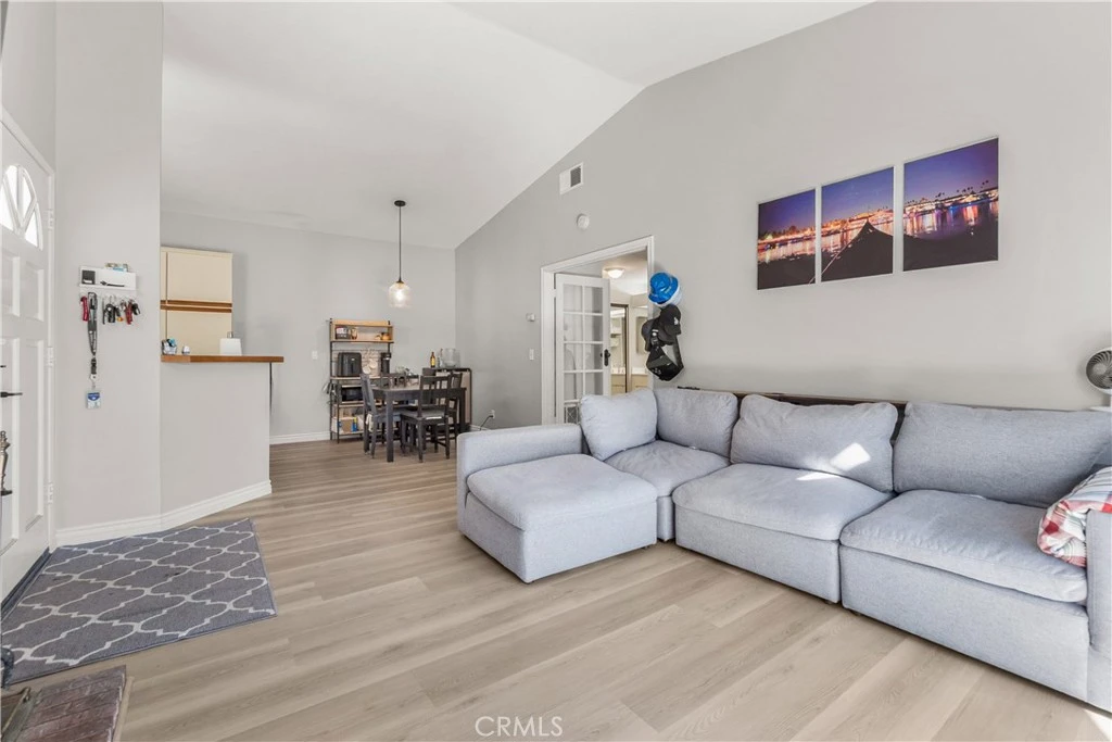 Resort living in Fountain Valley’s New Chase community. This stunningly remodeled upstairs 1BD/1BA condo boasts soaring high ceilings, fresh interior paint, and recessed lighting. Perfectly positioned directly across from the pool and one of the community's two hot tubs, the home features elegant double French doors and an abundance of natural light. Upgrades include new dual-pane windows, new waterproof luxury vinyl plank flooring, and a kitchen reverse osmosis system. The kitchen features new stainless steel appliances including a range, hood, and fridge, plus a breakfast bar. The living room with fireplace opens to a private balcony with new weather tiles and storage. The bathroom has a refinished vanity and updated fixtures. In-unit laundry with a stackable washer and dryer is included. Gated dog-friendly community with no breed restrictions. Residents enjoy access to a sparkling pool and two hot tubs, with the second spa located at the back of the complex for added convenience. HOA includes water, trash, and landscaping; just pay electric and internet. Recent HOA updates include pool and spa repaving, new asphalt roads, and new carport woodwork plus paint. Direct access to Santa Ana River trail and guest parking. Minutes to Mile Square Park and beaches. Stove, dishwasher, fridge, washer, and dryer included.