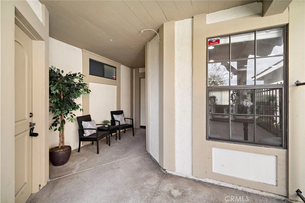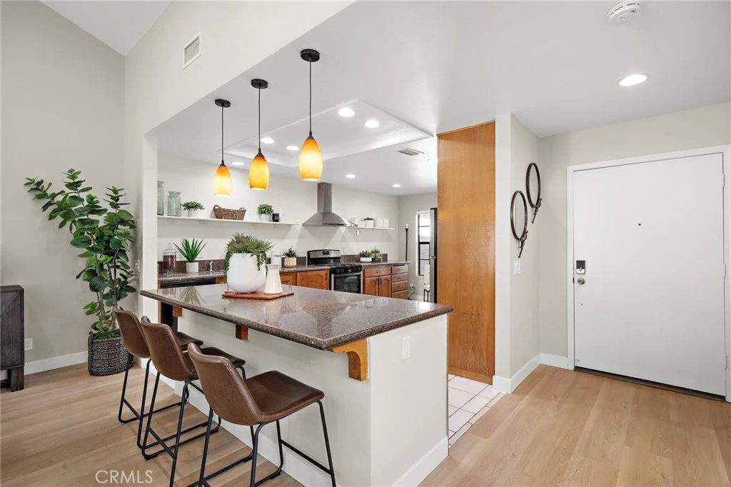 Located in the exclusive Kingsbriar enclave—an intimate community of only 22 quality-built Warmington Homes—this exceptional Fountain Valley townhome is truly one of the most beautiful you will ever see, offering the look and feel of a full single-family residence. This highly upgraded 3-bedroom, 2-bath home spans 1,566 square feet and welcomes you through a charming covered, gated courtyard with direct access to the attached two-car garage. Inside, soaring ceilings, extensive recessed lighting, raised-panel interior doors, central A/C, and wide-plank wood-style vinyl flooring (tile flooring in kitchen and baths) create a light, open, and refined ambiance. The stunning, massive remodeled kitchen is the heart of the home, featuring a center island with seating and chic pendant lighting, granite countertops, coffered ceiling with recessed lights, open designer shelving, deep stainless sinks, gas range with vent hood, dishwasher, abundant custom cabinetry, and a sunny eat-in breakfast nook. The expansive living room includes a fireplace, ceiling fan, and a spacious formal dining area, all seamlessly open to the kitchen in a true great-room design, with sliders leading to both a private atrium patio and a generous backyard complete with patio, garden areas, and block wall fencing. Double entry doors open to the luxurious primary suite that offers room for a sitting area, a walk-in closet, cathedral ceiling, and sliding doors to the atrium patio, along with a spa-style remodeled bath showcasing quartz countertops, dual sinks, a soaking tub, and a separate shower with marble-style surround, mosaic inlay, and frameless glass enclosure. Two additional bedrooms provide flexibility, including one with mirrored closet doors, while the guest bath features a granite-topped vanity and tub/shower combo with tile surround. Ideally located near Mile Square Park, shopping, dining, and just a short drive to the beach, this remarkable home combines privacy, elegance, and an unbeatable Fountain Valley lifestyle.