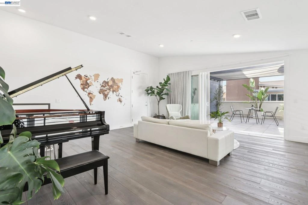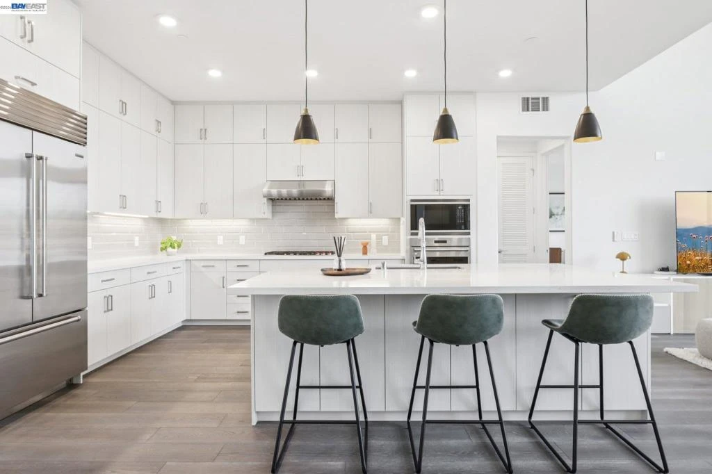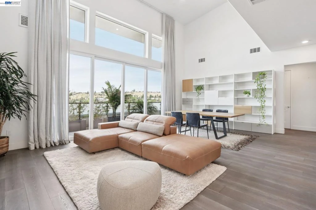 Rare Toll Brothers-built corner penthouse in Fremont’s sought-after Metro Crossing community, offering approximately 2,600 sq. ft. across the top 3rd and 4th floors. No neighbors above and no adjacent building blocking the views, offering exceptional privacy, openness, and natural light. 10-ft ceilings throughout and a soaring 15-ft ceiling in the living room, along with a dramatic 12-ft stacking slider and upper windows, create a bright and airy feel throughout.The open-concept great room flows seamlessly into the dining area and upgraded chef’s kitchen featuring top-of-the-line finishes, Wolf appliances, and a built-in Sub-Zero refrigerator. Two exceptional outdoor spaces include a large balcony off the main living area and a private rooftop terrace with a linear fireplace, perfect for relaxing or entertaining.The upper level offers a spacious media room and full junior suite, providing flexible space for guests, multigenerational living, or a home office. Custom built-in cabinetry adds style and functionality throughout.Additional highlights include a private two-door garage, dedicated storage room, and 240V EV outlet upgrade.Residents enjoy resort-style amenities in a prime location near Warm Springs BART, major commute routes, and Lila Bringhurst Elementary.
