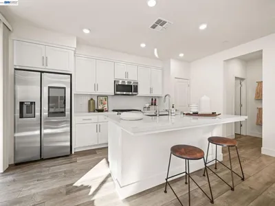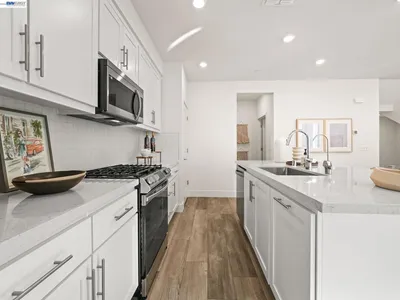 Welcome to this stunning corner-unit townhome built by Lennar in the desirable Innovation community. Built in 2023, this modern home offers 2 beds, 2.5 baths, and 1,326 sq ft of thoughtfully designed living space, plus an attached garage with ample storage. The bright living room flows into a stylish kitchen featuring quartz countertops, designer backsplash, island, pantry, built-in microwave, and stainless steel appliances. A dedicated laundry room includes washer, dryer, and storage. Upstairs offers two spacious bedrooms, including a primary suite with walk-in closet and private bath with dual sinks and glass-enclosed shower. A second bedroom and full hallway bath complete the upper level. Additional features include LVP flooring, EV-ready outlet, owned solar panels, and A/C. Enjoy community amenities including clubhouse, playground, BBQ area, fitness center, and pool. Walking distance to Lila Bringhurst Elementary and BART, with easy access to 680 & 880.