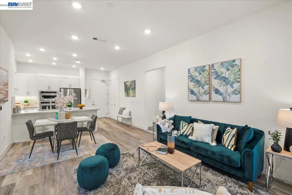 Beautiful Modern 2-bedroom, 2-bath condo featuring an open-concept layout with 10' ceilings and extensive upgrades throughout. The contemporary eat-in kitchen includes premium stainless-steel appliances, high-end cabinetry, a designer backsplash, and white quartz countertops. The primary suite offers a spacious walk-in closet and an upgraded bathroom with a double-sink vanity and a modern glass-enclosed shower. Additional features include a underground garage with parking for 2 cars, an EV charging outlet and personal extra storage area. Community amenities include a approx. 15,000 sq ft clubhouse with indoor-outdoor entertainment kitchens, lounges, and private event spaces; a resort-style heated pool with lap lanes, spa, and state-of-the-art fitness center; rooftop terrace; bike lounges; pet grooming areas; walking and biking trails; controlled access; community-wide Wi-Fi; and electric car charging stations. Located in the Warm Springs district with walking access to BART and convenient access to I-880 and I-680. Close to Mission Peak, Pacific Commons Shopping Center, Tesla, Silicon Valley, schools, and major commuter routes.