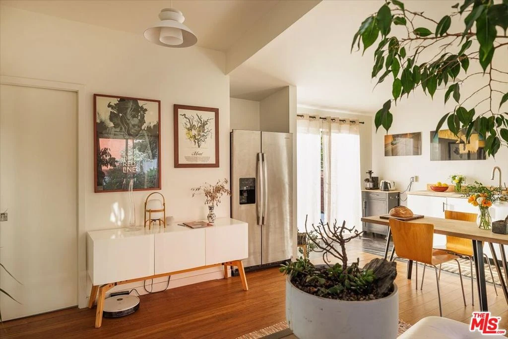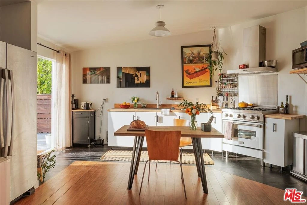 Perched at the top of the street in the sought-after Adams Hill neighborhood of Glendale, this unique hillside retreat offers two distinct living levels: a one-bedroom, one-bath upper residence and a two-bedroom, one-bath lower level with kitchenette, for which plans have been issued for a Junior ADU. Thoughtfully transformed by its creative owners into an inspired and artful compound, this property has been reimagined from its earlier life and now offers two separate living spaces that blend character, flexibility, and a strong connection to the outdoors. Enter from the street into the upper residence, a bright one-bedroom, one-bath space where the living, dining, and kitchen areas flow together with warmth and style. The kitchen features wood countertops and a ZLINE range, creating a beautiful and functional heart of the home. A cozy bedroom and striking bathroom finished in rich black and mauve tones add personality and charm. Sliding glass doors open from the kitchen onto a deck with sweeping hillside views overlooking the lush garden below. Outside, stairs lead down to the lower level, where two additional bedrooms and a bath create a versatile secondary living area. One room includes a kitchenette, while the other features warm wood parquet floors. The bathroom showcases distinctive concrete tile, and glass French doors from each room open directly to the garden, filling the spaces with light and greenery. The garden is the heart of the property, designed for effortless indoor-outdoor living. Terraced pathways wind through mature succulents and fruit trees including lemon, tangerine, and peach. At the center stands a magnificent avocado tree with a deck built around its trunk, creating a magical treehouse-like perch to relax, entertain, or enjoy sunset views. Artful, flexible, and filled with soul, this special hillside property offers a one-of-a-kind lifestyle in Adams Hill, one of Glendale's most beloved neighborhoods known for its quiet hillside streets, creative community, and sweeping views, with easy access to Atwater Village, Eagle Rock, and Glassell Park.