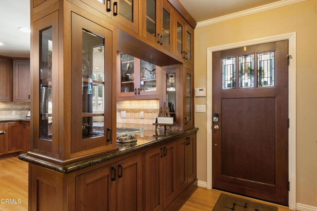 Welcome to 5015 Verwood Avenue where timeless charm meets practical sophistication in one of La Crescenta's most coveted neighborhoods. This exceptional home, on a tree-lined, cul-de-sac street, offers about 2,055 square feet on a 7,529 square foot lot. Step into the spacious living room with built-in cabinets in the entry, hard wood floors and a sliding French door that opens to the beautiful covered, wood deck. The living room features include a cozy fireplace and built-in cabinets on each side. The kitchen is open to the living room and dining area creating a large open great room. The gourmet kitchen boasts custom wood cabinetry, stainless steel appliances including a 28 bottle wine cooler. The island bar seating is great with a utility sink and cabinets. The dining nook has built in bench seating and storage too. Flowing through the kitchen is the family/media room with another sliding French door that opens to the deck. Toward the west of the living room is a hallway that leads to the three bedrooms. In the hallway is a large laundry closet for a side by side washer and dryer and there's built in cabinets and a utility sink. To the right is the primary suite with another sliding French door open to the deck and a good sized bathroom and large walk in closet with built in shelving. To the left of the hallway is a bedroom that has a man door that opens to the attached garage. The guest bathroom offers a dual sink, recessed lights, a hydro system bathtub, skylight and storage. At the end of the hall is the guest bedroom. The home has a fire sprinkler system, two tankless water heaters, central air and heat and a brand new roof installed approximately 2 years ago. The front yard is beautifully landscaped with good quality artificial turf and tasteful plants and flowers. The backyard has a redwood deck and patio cover and is also beautifully landscaped.
