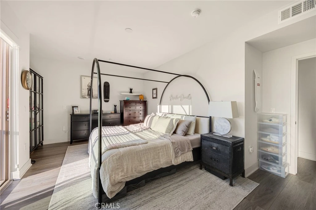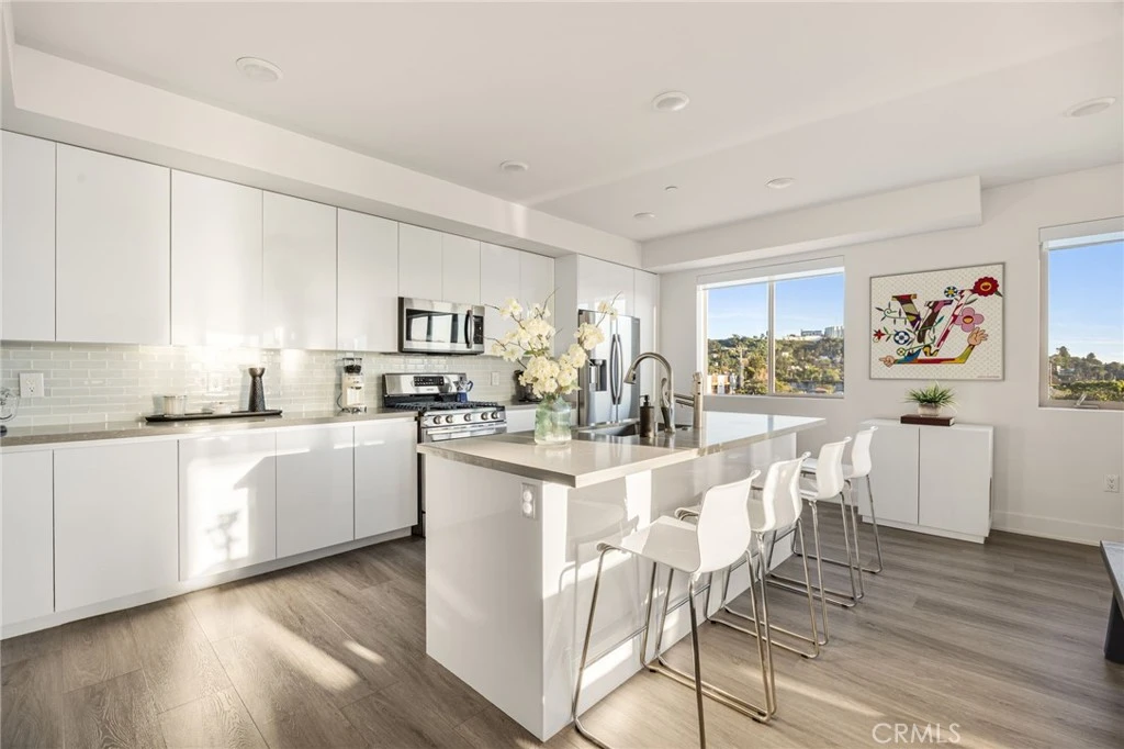 Updated 2-bedroom, 2-bathroom condo with city views, vaulted ceilings, and two private patios. Third-floor unit with a private walkway directly to your door — no shared hallways. The renovated kitchen features Samsung stainless steel appliances, a built-in wine fridge, quartz countertops, and a tile backsplash. Both bathrooms have been upgraded with glass shower doors and new lighting with dimmers. The primary suite includes a spa-style shower head and its own patio access. Wide plank vinyl flooring runs throughout. Custom built-ins and a media center anchor the living space, flowing seamlessly into the kitchen cabinetry. Fresh paint, custom blinds, and updated lighting throughout. Two private patios offer sweeping city and foothill views. Two gated, side-by-side subterranean parking spots with elevator access to the third floor. Extra storage in the secured garage. The 34-unit boutique building features a rooftop terrace with panoramic views, a central atrium courtyard, and a recreation room. Open floor plans, abundant natural light, and low-density living — just 34 homes across 42,000 square feet. Walking distance to Americana at Brand. Erewhon opening nearby.