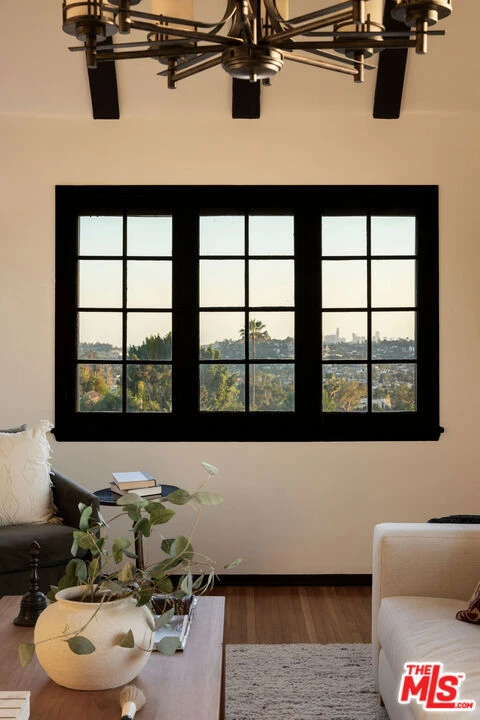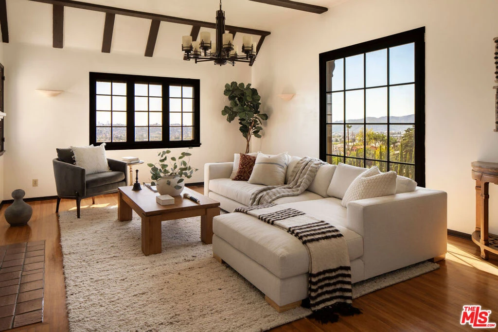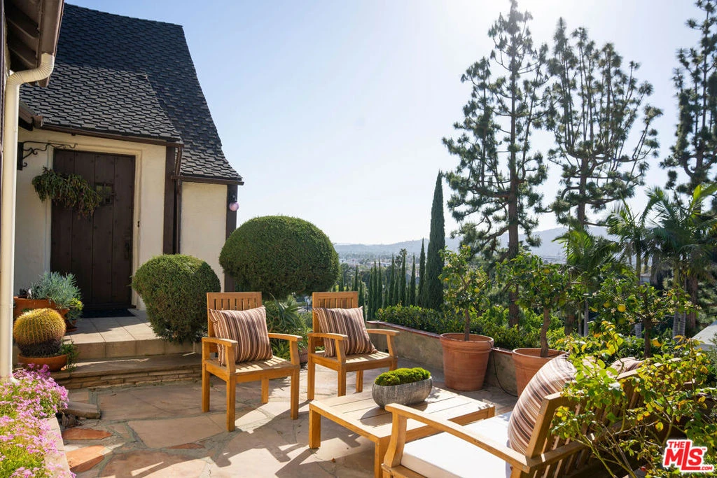 Perched on a private hillside in Glendale's coveted Chevy Chase Canyon, this timeless Tudor Revival captures sweeping 270-degree views stretching from the canyon below to the Downtown Los Angeles skyline and all the way to the Pacific Ocean. The elevated setting offers exceptional privacy and a breathtaking panorama of rolling hills, sparkling city lights, and distant coastal horizons. Rich in architectural character and enduring craftsmanship, the residence offers four bedrooms and three bathrooms across a gracious floor plan defined by traditional Tudor details. Warm hardwood floors, arched passageways, and original detailing create an atmosphere of timeless elegance throughout. At the heart of the home, the living room is both dramatic and inviting, with exposed ceiling beams, a statement fireplace, and expansive picture windows framing the surrounding hills and Downtown LA skyline. Flooded with natural light by day and glowing with city lights at night, it provides a beautiful setting for both quiet evenings and entertaining. Through graceful arched openings, the formal dining room sits between the living room and kitchen, creating a natural flow for gatherings. The kitchen blends warmth and functionality with custom wood cabinetry, stone countertops, stainless steel appliances, and generous storage, while a sunlit breakfast area provides a welcoming spot for casual meals or morning coffee. The home's bedrooms are thoughtfully arranged for comfort and privacy. The primary suite occupies the entire second floor, creating a true retreat with vaulted ceilings and a dramatic arched window framing DTLA skyline views. Generous in scale, the suite offers space for both sleeping and sitting areas, while the adjoining bath features a Japanese-style soaking tub, a brand-new walk-in shower, and distinctive geometric windows that bring in soft natural light. Additional bedrooms on the main level are well-proportioned and versatile, served by two bathrooms including a charming hallway bath with vibrant vintage turquoise tile and an additional en-suite bath. Outdoor spaces further enhance the home's sense of retreat. At the front of the home, a flagstone patio offers a picturesque setting for al fresco dining beneath mature trees and cafe lights. Above the garage, a private terrace provides another inviting seating area and a perfect perch for canyon and city views. Behind the home, terraced hillside gardens unfold with winding paths and multiple seating areas overlooking the surrounding landscape. The property spans street-to-street, ensuring no neighbors directly behind and enhancing the sense of privacy. Set within one of Glendale's most picturesque hillside neighborhoods, this exceptional property offers a rare combination of architectural character, breathtaking views, and tranquil outdoor living.