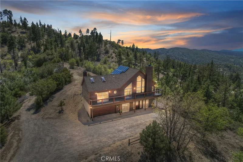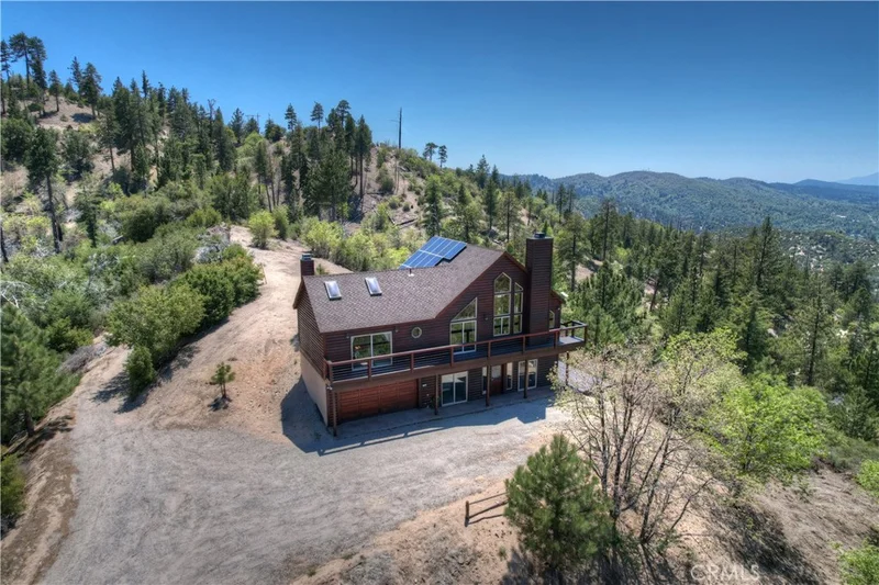 !!!VIEWS & MORE VIEWS!!! A rare opportunity! Escape to your own mountain sanctuary on five acres in the coveted Crab Flats area of Green Valley Lake. This stunning 5-bedroom, 2-bathroom home showcases breathtaking panoramic views of the mountains, hills, high desert, and Lake Arrowhead stretching across the distant valley, where every sunset becomes a daily celebration on your expansive estate. The wraparound deck and multiple dual pane windows frame spectacular vistas while flooding the rooms with natural light. The outdoor jacuzzi provides the perfect vantage point for soaking in legendary sunsets while nature's soundtrack plays around you. The Bottom level features the front door leading into the open foyer, bedroom 1 with garage access and separate outdoor access, bedroom 2, the laundry room, bonus office nook, the full bathroom, and bedroom 3 with bottom deck access to the jacuzzi. Head up to the Main level and immediately notice the beautiful vaulted beamed ceilings, sunken living room with river rock fireplace, wraparound deck access, and even more expansive views. There is always plenty of room in the dining area and kitchen for indoor entertaining! The Main level also features bedroom 2 with exterior access, the full bathroom with dual sinks, and the primary bedroom with exterior access, bright skylights, walk-in closet, and its own river rock fireplace. The solar and Generac-powered, off-grid design appeals to those valuing sustainability and self-sufficiency. The attached two-car garage provides convenient storage for vehicles and outdoor gear essential for adventure enthusiasts. What truly sets this property apart is its remarkable seclusion across five private acres. Away from traffic and urban noise, this peaceful haven offers the rare opportunity to disconnect and recharge while maintaining modern comforts on your own mountain estate. The surrounding wilderness also provides endless recreational opportunities, making this an ideal basecamp for hiking, fishing, off-roading, mtn or dirt biking, and exploring Green Valley Lake and other mountain regions. This is more than a home - it's a lifestyle choice for those ready to embrace tranquil mountain living with unforgettable views.