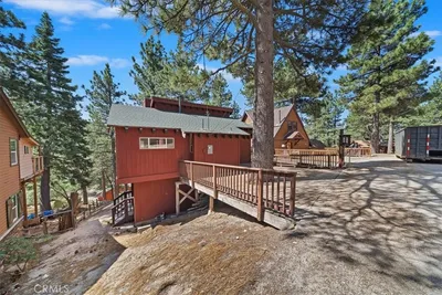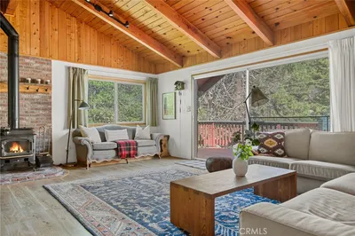 Escape to your own mountain retreat! This charming cabin offers the perfect blend of rustic warmth and modern comfort. Designed with an inviting open floor plan featuring a rock wood burning fireplace, the heart of the home is filled with natural light streaming though dramatic floor-to-ceiling windows, bringing the beauty of the outdoors in. The kitchen features cozy bay windows the create a sunny nook, ideal for morning coffee while taking in peaceful forest views. With three spacious bedrooms and three full baths, the cabin provides both privacy and convenience for family and guest. A welcoming family room centers around a second stunning rock fireplace, creating the perfect gathering place on cool mountain evenings. The master suite offers bay windows with French doors leading out to your own private balcony. Cabin offers wrap-a-round decks perfect for entertaining on those warm summer evenings in Green Valley lake. Whether you're relaxing indoors or simply gazing out at the surrounding trees and serene woodland scenery, every space in the home is designed to feel warm, comfortable, and connected to nature. This is more than a cabin-it's a peaceful retreat where rustic charm meets modern ease, and every window frames a picture perfect view.
