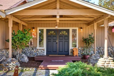 **Huge price reduction ** This beautiful, newly constructed Lakefront house is ideally situated in the desirable Pine Mountain Lake area. The attached guest house can also be an Accessory Dwelling Unit (ADU) for additional monthly income. Inside, you'll find granite countertops and laminated flooring in the bathrooms and throughout the main living spaces. The tastefully designed gourmet kitchen features modern amenities, with brand-new matching stainless steel appliances. A large island counter and breakfast bar invite casual dining in the kitchen. This all-electric home allows you to comfortably do your part to combat climate change, with the capability to charge up to four electric vehicles. It is pre-wired for two electric vehicle chargers in the garage, one at the parking pad, and a fourth on the street at the top. Additional features include Vaulted high ceilings, an 80-gallon electric water heater, individual mini HVAC units, dual-pane windows, and sliding doors. The main house offers three bedrooms, an office, a bonus room, and two and a half baths, spanning approximately 2,893 square feet. The lake views are beautiful and calming, visible from both the living room and the outdoor decks on each floor.