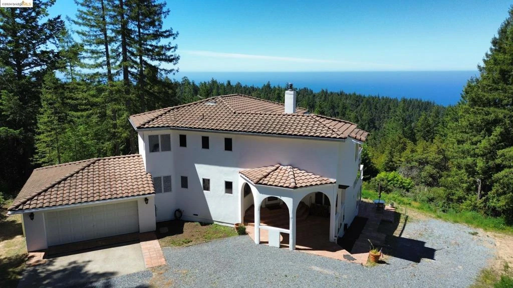Grand Spanish Colonial home on 10 acres in the sunny Banana Belt. Arriving here feels like entering another world. There is not a house in sight - just peace. It sits above the fog line with total privacy and blue ocean views from nearly every room. Only 5 min to local beaches. Fall asleep to the distant sound of crashing waves. Diverse wildlife call your property home including many bird species. Sunset Climate Zone 15 offers ideal growing conditions. Upon entry you are greeted by heated marble floors and an elegant curved staircase with custom ironwork. The family room has vaulted ceilings leading to a solarium and large deck. There is over 1400 sq ft of deck space. The kitchen boasts new SS appliances and an induction range. Downstairs offers a large Saltillo tile patio, wine room, home gym and cedar sauna. There is marble tile, hand-carved doors and wood-clad windows throughout the home, including the intricately-carved main door signed by the artist. A 7-camera Ring security system and 200mbps Starlink dish come with the house. New well pump and septic tank. New flooring, paint and fixtures. Plus, you get a RV parking spot and partially finished two-story guest house with ocean views and a new roof. Explore the trails, seasonal ponds and streams.