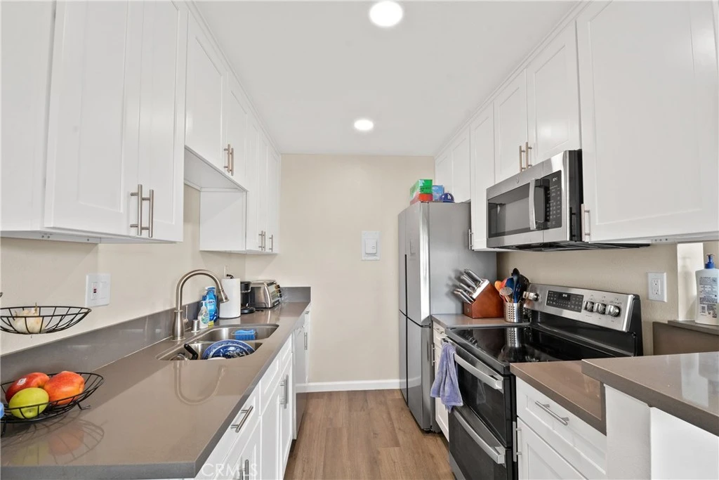 Welcome to this beautifully upgraded 1 bedroom, 1 bathroom condominium that offers the perfect blend of style, comfort, and convenience. This light filled upper level unit features an open and airy living space, vinyl flooring, recessed lighting, and seamless access to a private balcony, ideal for relaxing or entertaining. The fully remodeled kitchen showcases sleek cabinetry, quartz countertops, stainless steel appliances, and modern lighting, flowing effortlessly into the dining area. The bathroom has been tastefully updated with quartz surfaces, upgraded fixtures, and a refreshed tub/shower design. The spacious bedroom continues the modern aesthetic with updated flooring, recessed lighting, and stylish glass closet doors that enhance the contemporary feel. Additional updates include interior paint, AC unit. Residents enjoy amenities including multiple pools, a spa, BBQ areas, greenbelt spaces, and well maintained community grounds. This turn key home is the perfect opportunity for anyone seeking low maintenance living in a beautifully updated space. This home will not last. Schedule your tour today!