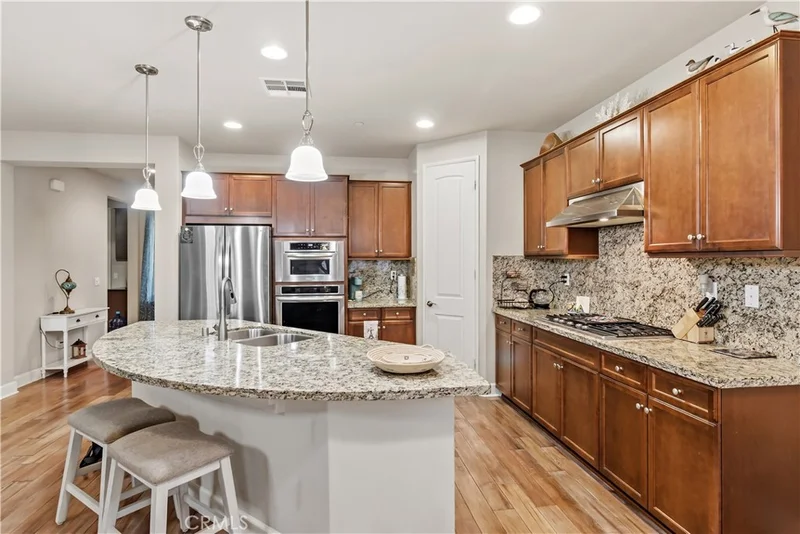 Located in the highly desirable 55+ Solera Diamond Valley Community by Del Webb, this beautiful 3 bedroom, 2 bathroom home offers comfort, quality, and numerous upgrades. The home features an ideal open-concept floor plan with a spacious kitchen that flows seamlessly into the living and dining areas. The kitchen includes stainless steel appliances, granite countertops, a large center island with breakfast bar, upgraded fixtures, a pantry, and a generous dining area. Wood flooring runs throughout the main living and high-traffic areas. The laundry room includes additional storage cabinets and a utility sink. The spacious primary suite offers plenty of room to relax, while the primary bathroom features dual sinks, a soaking tub, and a step-in shower. The second and third bedrooms are also well sized. Additional upgrades include paid solar panels, a central vacuum system, electric vehicle charging station, fire suppression sprinkler system, ceiling-mounted garage storage, and gutter guards designed to help prevent leaf buildup, all adding convenience, efficiency, and peace of mind. The front patio courtyard provides a great space for relaxing or entertaining. The backyard has been meticulously maintained and features a covered patio, concrete hardscape, low-maintenance artificial grass, and space for shrubs and flowers. Residents of Solera enjoy access to an impressive community center featuring a fitness center with walking track, library, billiards room, conference rooms, theater, indoor pool, two outdoor pools, bocce ball courts, tennis courts, pickleball courts, and a wide variety of social activities and events.
