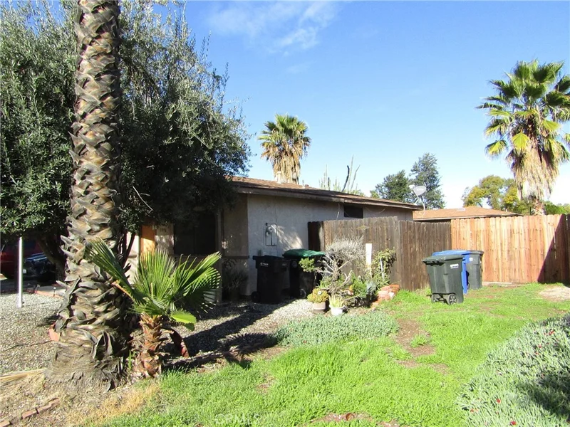 Cozy 2 bedroom house with large living room. One bedroom has patio doors to covered patio and large fenced back yard. Kitchen has dining area, with a galley type food prep area and countertops, built-in dishwasher, and microwave. Kitchen also has laundry, and door into attached garage. Bathroom has shower over tub. Newer carpet in living room and 2 bedrooms. Additional storage structure is attached to garage and covered rear patio. Back yard is large with flat useable space, surrounded by wood privacy fence. The attached garage shares a common wall with the next-door garage, as is common in this 55+ development.