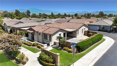 PRICE IMROVEMENT!! Welcome to this cozy, bright move-in ready and The only corner Lot home available as of this moment in THE LEDGENDS Plan. Just cross from the lodge in 55+ community of Four Seasons in Hemet.This fully gated neighborhood with 24/7 security is surrounded by serene hills and the Hemet Golf Course, offering a active adult lifstyle. This corner lot home offeres a huge inclosed out door patio entry from kitchen sliding door for you to enjoy your morning coffee. Step inside to find out bright and airy living space featuring brand new ceiling fans, new Tile flooring, fresh painted kitchen cabinets with new hardware, wooden shutters almost throughout the entire house.Living area offers you to covered alumawood patio cover area to sit for your afternoon get together with friends and family. An excellent location within a short distance to the lodge,pool,spa,on site golf course and variety of activities that community has to offer.The community amenities are unparalleled! The lodge features a bistro,movie theather,ballroom,beauty shop,liberary,computer room,and more. Residence enjoy access to a swimming pool, tennis and pickleball courts,an exercise room,and variety of engaging activities. And wait till Holidays when the ballroom lights up for New Year's!! A truly must see property!!