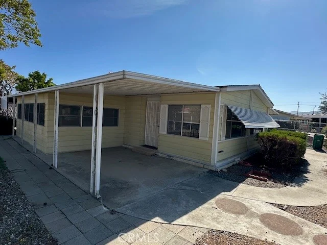 Located in E. Hemet in a senior area sub-division. Manufactured home on a permanent foundation. Features two bedrooms, Living room with dining area with a bult in hutch. Spacious kitchen with new appliances that open onto a large family room with a nice sky light. There is an enclosed patio with new laminate flooring, great for hobby/utility room. Large master suite with master bath that features separate shower and large bathtub. Second bedroom ahs access to jack and jill bathroom shared with the indoor laundry room. This manufactured home has a new roof, new, New kitchen Appliances, laminate flooring throughout and fresh interior painting. Two sheds. Nice quiet cul-de-sac location. Well worth the look!
