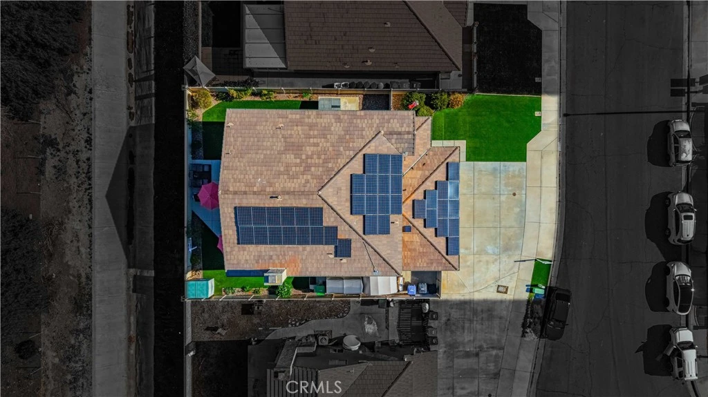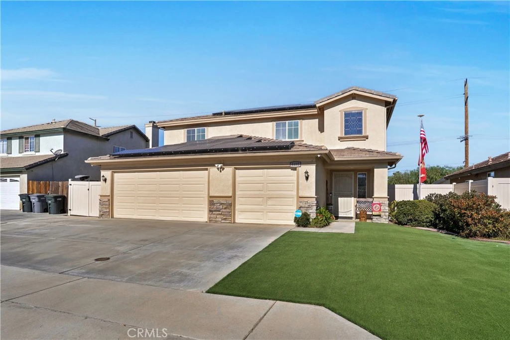 A beautiful and spacious 3,100+ sq ft home in West Hemet. Steps away from Harmony Elementary school and West Valley High School, it is conveniently located near Domenigoni Parkway. Home is powered by Solar (35+ panels) and batteries. Home is set up to beat Edison's ever increasing prices -you could run on solar in the morning, switch to batteries in the evening -running off grid. There is even an EV Charging plug in the 3-car garage all designed to save you money and gasoline too!!! This two-story home with a loft boasts 5 bedrooms, 3 bathrooms, and an upstairs laundry. Lovingly maintained home features plantation shutters, LVP flooring, granite countertops in the kitchen, a whole house water filtration, tankless water heater, new ceiling fans, whole house fans in each upstairs bedroom, and much more. Attractively landscaped front yard with lush synthetic turf. The backyard is fully enclosed with newer vinyl fencing installed in 2020 and offers exceptional outdoor living space. Multiple cement patio pads provide ample room for seating and entertainment. A built-in outdoor barbecue kitchen with refrigerator creates the perfect setting for gatherings with family and friends. This home is not in an HOA and has low taxes and no mello roos.