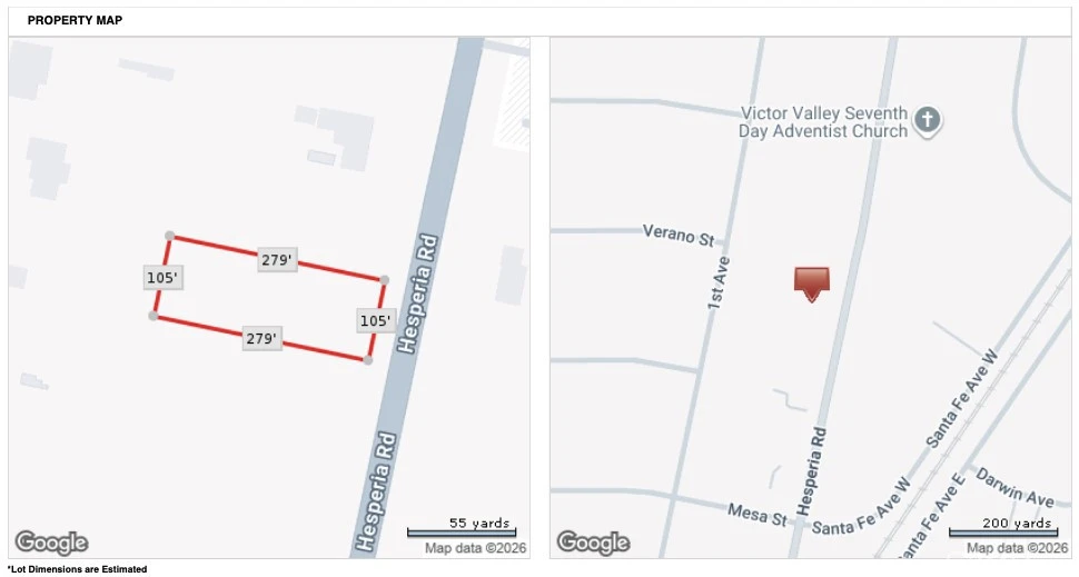 Prime opportunity to build in the growing city of Hesperia! This 29,400 square foot (.67-acre) vacant lot is ideally located on Hesperia Rd, offering excellent accessibility and visibility. Positioned near a local high school, established residential neighborhoods, and expanding developments, the property is surrounded by ongoing growth and demand. Conveniently close to shopping centers, dining, and everyday amenities, this lot presents a great opportunity for builders, investors, or those looking to design a custom home in a well-connected area. With its generous size and desirable location, this parcel offers the perfect canvas to bring your vision to life in one of the High Desert’s most active markets.