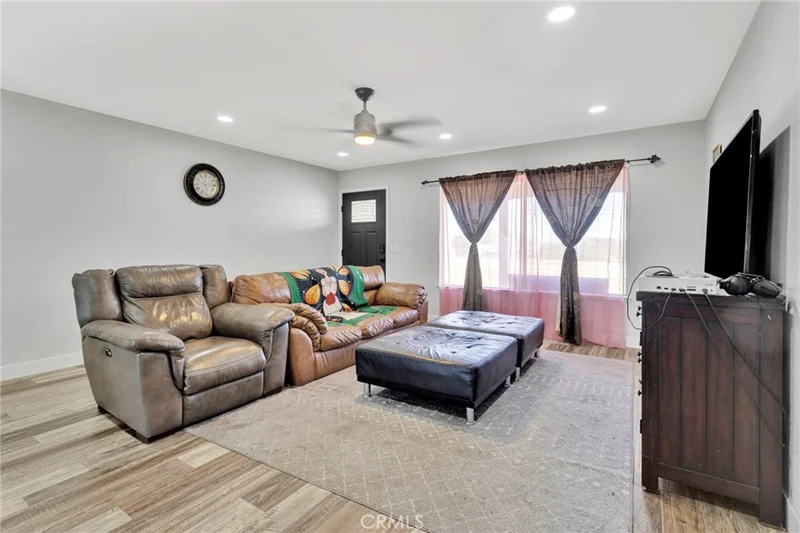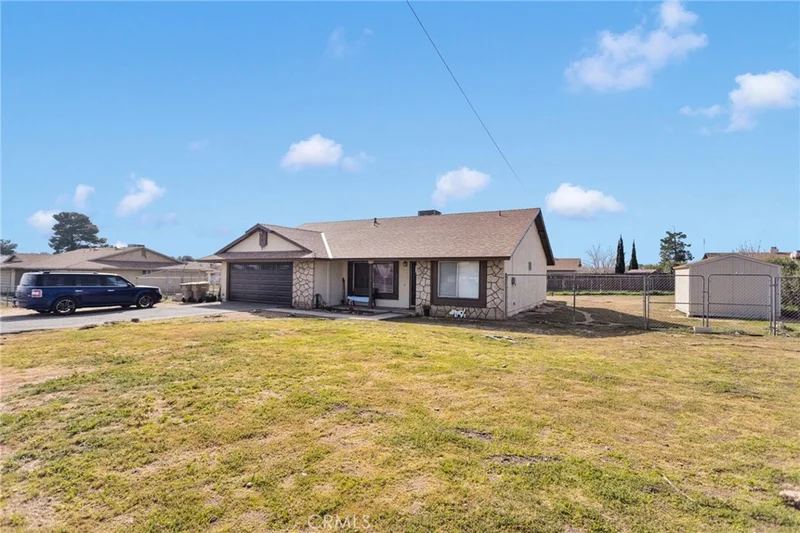 Welcome to this charming 3-bedroom, 2-bathroom home situated on a generous 0.4-acre lot in Hesperia. Offering 1,512 square feet of living space and a 2-car garage. As you step inside, you’re greeted by the living room featuring laminate flooring and an open floor plan that seamlessly flows into the beautifully remodeled kitchen. The kitchen is a true standout, showcasing navy blue cabinetry, quartz countertops, a large center island, stainless steel appliances, and a walk-in pantry, perfect for entertaining and everyday living. The home offers two spacious secondary bedrooms and a full bathroom. The primary suite provides two separate closets and a primary bathroom featuring a walk-in shower. Step outside to enjoy the expansive fully fenced backyard, ideal for outdoor gatherings, toys, pets, or future projects. The yard features a covered concrete patio, a separate 32x12 concrete slab ready for a workshop or carport, a storage shed, and RV access. Conveniently located near Main Street, this home offers easy access to shopping, restaurants, pharmacies, schools, and the 15 Freeway, making commuting and daily errands a breeze.