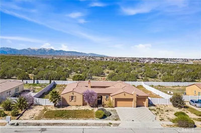 Walk through the enticing front yard and mediterranean-style arched entrance into the calming courtyard. Continue into this beautiful, move-in ready home that awaits you in a quiet corner of Hesperia! A Single-Level Home with 5 Beds, 4-1/2 Baths and a well-designed interior; great for those who want to live in the High Desert! The next-gen design features flexible living spaces, perfect for you or for renting out! A spacious kitchen with an island and walk-in pantry, a living room with a fireplace, and a primary suite with walk-in closet, bathtub and separate shower. A bonus room you can use as an office, a play room, or a music room. From the courtyard, with its outdoor fireplace and sitting area, enter the guest quarters, which include a bathroom and a kitchenette. Across from the guest quarters, enter the spacious 3-car garage. Walk through the garage onto the large, wide driveway, which provides plenty of space for an RV or boat. The attractive front and back yards both require low maintenance, with a beautiful fountain in the back. The neighborhood is on the edge of the city and is tranquil. And there is NO HOA TO PAY! Close to the future Brightline West High-Speed Train Station, which when completed, will serve Hesperia! Just a few minutes to the 15 Freeway and local schools. Conveniently located close to many shopping and dining opportunities, including The Mall of Victor Valley, Walmart, Target, Ross, Stater Brothers and numerous restaurants.