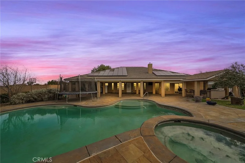 Spectacular Oak Hills Estate with Pool & Massive Workshop/RV Garage! Welcome to this exceptional 4-bedroom, 3.5-bath custom home offering 3,216 sq ft of living space on an expansive 83,635 sq ft lot. This unique property is ideal for entertainers, hobbyists, and RV enthusiasts alike. The home features two primary suites, walk-in closets in every bedroom two in the main suite, plus a bonus room off the primary bedroom, the living room has a pellet stove, and the formal dining room offers built-in cabinetry. The kitchen offers Italian Silestone and granite countertops, designer backsplash, pull-out drawers, and an oversized island—perfect for gatherings. Step outside to an entertainer’s paradise with a sparkling pool and spa, fire pit, built-in BBQ, extended patio with electric shutters, and beautifully landscaped grounds. Enjoy the garden area with grapevines and fruit trees, fire ring, shed, metal boat cover, and automatic sprinklers. The property is fully fenced and cross-fenced for added versatility. A standout feature is the massive workshop/RV garage equipped with three automatic garage doors, air compressor system throughout, two sinks with hot water, its own water heater, full bathroom with shower, intercom system, alarm system, and full RV hookups. The shop has its own septic system, with a separate septic serving the home. Additional highlights include intercom throughout the house and shop, RV access to the shop, two septic systems, and close proximity to the I-15 freeway—ideal for commuters. This rare Oak Hills property offers space, functionality, and endless possibilities for multi-generational living, business use, or enjoying privacy and country-style living.