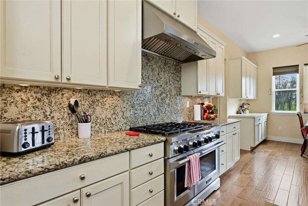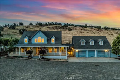 Like living in a park! This thoughtfully appointed Contemporary Craftsman on nearly 5 acres offers space, comfort, and exceptional functionality. Since it's said that the kitchen is the heart of the home, consider this a home with a huge heart. This expansive kitchen features an oversized island with bar seating, sunny breakfast nook, abundant cabinetry, and matching stainless steel KitchenAid appliances, including a 6-burner gas range, double oven and built in refrigerator. A coffee bar, large pantry, mudroom with extra fridge, and laundry room with utility sink complete this efficient hub. The kitchen flows into a spacious family room with a cozy gas fireplace, rich engineered hardwood floors, tray ceilings, and 12-foot or higher ceilings throughout the house. A private office with rolling barn door and a formal dining room with built-ins offer flexible living options. Get creative with how you choose to use them! Just off the family room, the covered patio “California room” overlooks the oak-studded, pasture-like grounds, inviting outdoor gatherings with its wood-burning fireplace and serene views. The bedroom wing includes a primary suite with outdoor access, two walk-in closets, jetted tub, walk-in shower, dual sinks, vanity, and private water closet. A junior suite, with its own full bath and walk in closet and two additional bedrooms, full bath, and powder room complete the layout. Outside, the space is just as thoughtful and spacious as it is inside. Enjoy peace of mind with no HOA fees, a 50-year tile roof, an RV pad with full hookups, a circular drive, and six garage spaces—an attached 2-car plus two detached 2-car garages (one with workshop and half bath). A well with filtration and treatment systems supplies the property with all its water needs. Fully fenced and cross-fenced with programmable sprinkler irrigation and a keypad-controlled security gate. One can easily imagine adding ranch animals or a pool to this level, open space (maybe both!) This peaceful, park-like setting is sure to be the backdrop for many happy memories to come.