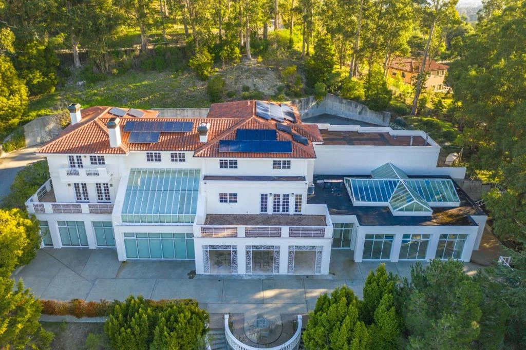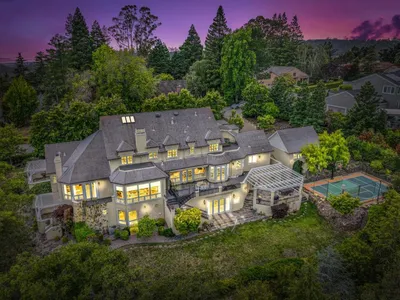 Perched on nearly two acres at the end of a quiet cul-de-sac in Hillsborough's sought-after Carolands neighborhood, this gated Mediterranean contemporary estate offers privacy, scale, and sweeping hill views. Remodeled in 1996 by a principal architect of Frank Lloyd Wright's company, the home showcases refined contemporary living with timeless architectural influence. Walls of glass, skylights, and French doors fill the interiors with natural light. A grand foyer with spiral staircase and chandelier sets the tone, opening to elegant living and dining rooms with fireplaces, hardwood floors, and view balconies. The showpiece is the expansive chef's kitchen, thoughtfully designed with COMMERCIAL-GRADE stainless steel appliances, custom cabinetry, and generous workspace. A striking breakfast bar with Wolf gas griddle anchors the space, while French doors open to a balcony, creating seamless indoor outdoor flow ideal for entertaining. The upper level features four en-suite bedrooms including a luxurious primary suite with fireplace, private balcony, dual walk-in closets, and spa-like bath. Lower level amenities include a wine cellar, bar, media area, indoor pool, and guest suite. Experience this exceptional estate in person and schedule your private tour today.