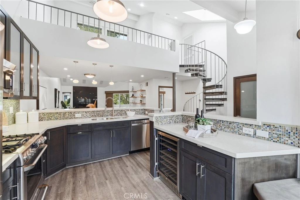 Welcome to the prestigious 24-hour guard-gated community of Pacific Ranch—where resort-style living meets the effortless coastal lifestyle of Huntington Beach, just moments from the sand. Rarely available and highly sought after, this exceptional 2-bedroom residence with an upstairs loft offers over 1,400 square feet of thoughtfully designed living space, enhanced by soaring ceilings and an abundance of natural light that create a truly open feel. The home has been beautifully curated with luxury vinyl flooring, dual-pane windows, recessed lighting, and smart home features including a Nest thermostat. The open-concept layout seamlessly connects the main living areas. The kitchen is both refined and inviting, featuring maple cabinetry, stone countertops, stainless steel appliances, a designer backsplash, breakfast bar, and beverage refrigerator—perfect for entertaining. The spacious family room showcases a custom stone fireplace, surround sound system with a dedicated entertainment closet, and sliding doors that open to a private balcony overlooking lush greenbelts. The primary suite offers vaulted ceilings, custom-organized closets, and direct balcony access for seamless indoor-outdoor living. The spa-inspired bath features stone countertops and a walk-in steam shower. The secondary bedroom is generously sized and paired with a beautifully upgraded full bath. A striking spiral staircase leads to the versatile loft, ideal as a third bedroom, office, or media room. Additional highlights include an enclosed one-car garage, assigned parking space, inside laundry, skylights, and thoughtful upgrades throughout. Residents of Pacific Ranch enjoy pools, spas, a clubhouse, streams, and beautifully maintained grounds. Ideally located near Seacliff Shopping Center, Huntington Beach High School, and just a short bike ride to the iconic Huntington Beach Pier, Pacific City, and Main Street—this is coastal living at its finest.