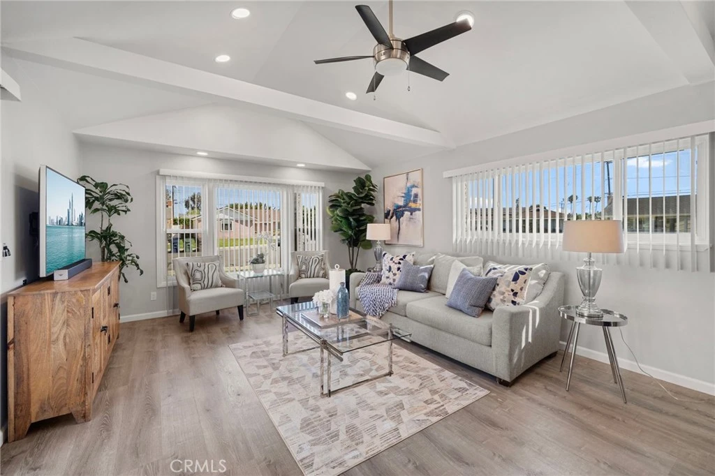 This exceptional expanded Dutch Haven single story home is truly one-of-a-kind, offering gorgeous upgrades, thoughtful expansion, and a highly versatile floorplan ideal for multi-generational living or flexible use. Situated on an extra large 7,100 square foot interior corner lot in a prime Huntington Beach location, this property features a double gated side entrance to a concrete RV parking pad, an extra wide driveway, and beautiful tropical landscaping with mature palm trees. The home offers two separate living zones with dual access, including a secondary kitchenette (not permitted but quality built) with granite countertops, gas cooktop, vent hood, sink, white shaker cabinetry, and a cozy eat-in dining area, creating the perfect setup for extended family, guests, or private quarters, while still easily functioning as one spacious residence with approximately 1,575 square feet, 3 bedrooms, and 2 bathrooms. The main living area has been expanded by approximately 375 square feet and showcases a stunning open beam cathedral ceiling, abundant natural light, and seamless flow into the original living room with raised hearth fireplace, now serving as a banquet-sized formal dining room adjacent to the beautifully remodeled kitchen featuring quartz countertops, deep stainless farmhouse sink, stainless steel appliances, custom soft-closing white shaker cabinetry with deep drawers and hidden trash, and a sunlit breakfast nook. Additional highlights include dual pane windows and sliders, luxury vinyl flooring throughout, recessed lighting, raised panel interior doors, new interior and exterior paint, a 200 AMP electrical panel, and a new water heater. Both bathrooms have been fully remodeled with new vanities, granite countertops, updated fixtures, with a walk-in shower in one and a tub/shower combination in the other. The wrap-around backyard with extra wide side yards is a private, tranquil oasis featuring a large covered patio, separate pergola with fire ring, lush tropical landscaping, multiple vegetable garden areas, block wall fencing, and a variety of fruit trees including navel oranges, grapefruit and Thai bananas, perfect for entertaining or relaxing while enjoying the coastal breezes. Ideally located near excellent schools, parks, shopping, dining, freeway access, and just minutes to the beach.