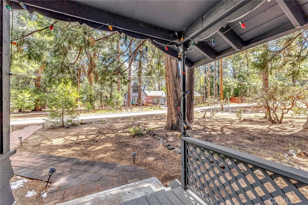 This 1967 updated ranch-style mid-century home offers a comfortable, easy mountain lifestyle with a clean, cohesive feel throughout. Set on a county-maintained road for year-round access, the property features level entry, a carport, and a layout that makes everyday use simple. Inside, engineered bamboo flooring runs throughout, and the refreshed interior brings a subtle mid-century character that feels both current and true to the home. The kitchen is anchored by a wrap-around breakfast bar with generous counter space and storage. Just off the entry, the dining area connects easily to the kitchen, while access to the spacious back deck is just beyond, creating a natural separation between indoor gathering space and outdoor living. One of the bedrooms offers direct access to the deck, adding to that relaxed indoor/outdoor connection. The living room is the heart of the home, with vaulted, beamed ceilings, a river rock fireplace, and large windows that bring in natural light and views of the surrounding trees. It’s open, inviting, and comfortable without trying too hard. The bathroom has been fully updated with a clean, spa-like feel that adds a touch of everyday comfort. Both bedrooms feature built-in closets and cabinetry, a classic mid-century detail that adds function and character. The backyard is fully fenced, making it a great setup for pets, while the rest of the lot remains open and usable. A large, forested neighboring parcel adds a sense of space, privacy, and a natural backdrop. Offered furnished, this is a move-in ready mountain home that combines charm, function, and a sense of ease from the moment you walk in.