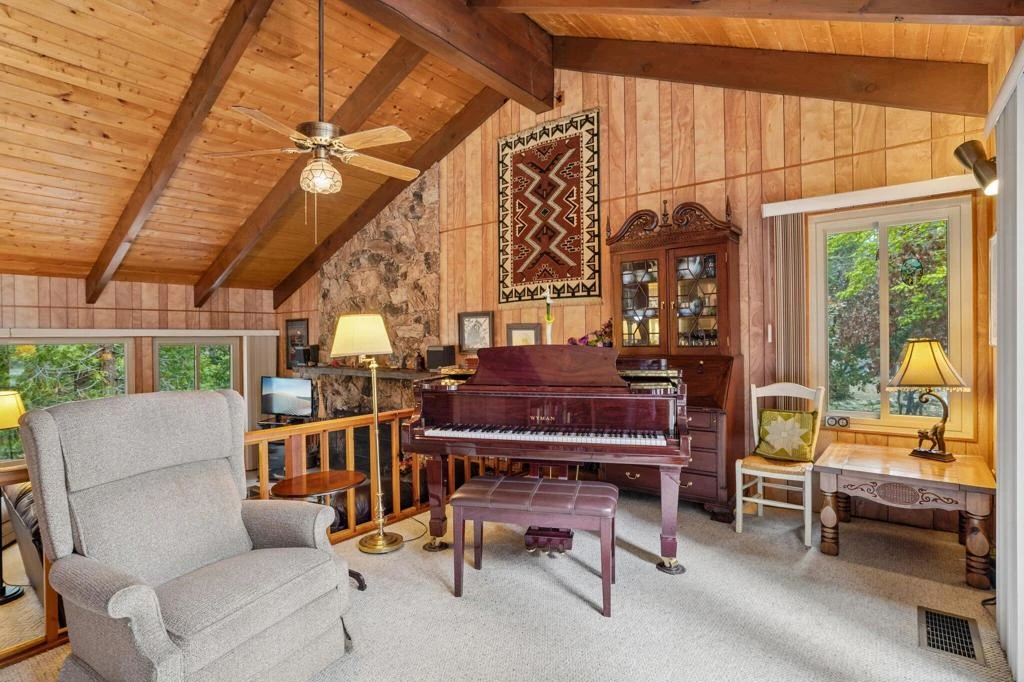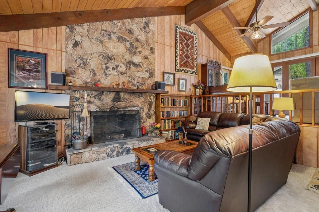 Tucked among the pines, this inviting split-level cabin offers the perfect blend of comfort and mountain charm on a spacious 0.37-acre street-to-street lot. With 1,480 sq ft, the home welcomes you with vaulted ceilings, dual-pane windows, and a stunning rock fireplace that anchors the open living, dining, and kitchen area. Step outside to a wraparound deck and private balcony--ideal for morning coffee or quiet evenings under the pines.The flexible layout features a bedroom and full bath on the lower level, while the private primary suite is tucked upstairs. A bonus living room or sitting area provides the perfect space for guests, a reading nook, or home office. Central heat and convenient laundry hookups off the kitchen add everyday ease.Outdoors, enjoy a circular driveway, EV charging plug, sheds, and a storage container. The property is dotted with 7 fruit trees and supported by sprinkler irrigation. Recent upgrades include a newer roof and hot water heater. Offered turnkey furnished, making it easy to settle in and start enjoying right away.A true mountain retreat with space, character, and convenience--schedule your showing today and experience the lifestyle for yourself.