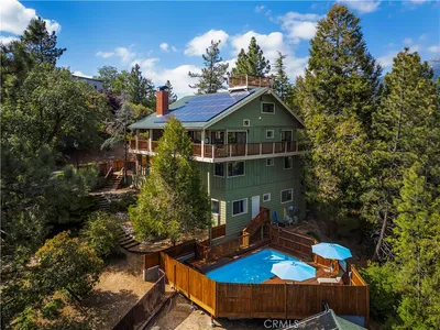 PLEASE READ FULL DESCRIPTION -- Seller now offering a $20,000 credit to buyer for closing costs and rate buy-down.Mid-century modern design blends with mountain ranch living in this beautifully updated sanctuary just minutes from town and the Idyllwild Arts School. Set on a .41-acre lot, this home offers architectural charm, natural beauty, and modern comfort. Inside, soaring beamed ceilings and abundant natural light create a warm, open atmosphere. With five bedrooms, four bathrooms, and an attached casita, the flexible layout suits a variety of living needs. Two grand river rock fireplaces and a potbelly stove in the primary bedroom add cozy mountain character. The kitchen features terrazzo countertops, green Zia tiles, dual Ravioi brass sinks, and striking mid-century modern lighting. Saltillo tile floors run through the main living areas, while a new Ecobee system offers central heat and whole-home music streaming. Outside, enjoy rose gardens, mature fruit trees, a jacuzzi, and a large outdoor dining area. Extras include a three-car garage, new water heater, and rare sewer connection.