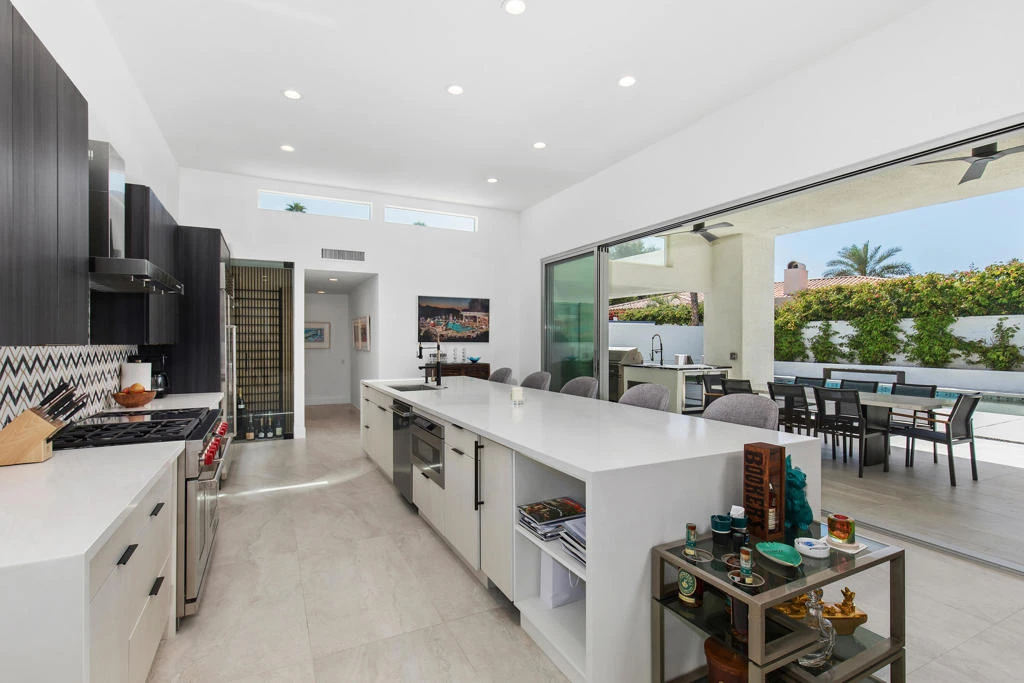 Available NOW! Turnkey- For Summer 2025 and Season 2026 Ready for you- ask for discount prices for the summer and multiple months.This remarkable contemporary luxury home, completely renovated, is nestled in one of Indian Wells' most prestigious neighborhoods and is available for rent. Upon entry, you're greeted by an impressive all-glass center pivot architectural door, setting the stage for an exceptional desert living experience. Inside, the spacious open floor plan features expansive dining areas, soaring 12-foot ceilings, a captivating ''Fire and Ice'' fireplace, and stylish modern appointments throughout.Enjoy seamless indoor/outdoor living with an impressive 18-foot floor-to-ceiling pocket door and beautiful porcelain tile flooring both inside and out. The newly renovated gourmet Chef's kitchen boasts modern cabinetry, quartz countertops, a Wolf double oven range, Sub Zero refrigerator/freezer, a chic glass-enclosed wine closet, and a separate walk-in pantry.Retreat to the luxurious Master Primary Suite overlooking the pool and stunning mountain views, complete with a spa-like bath and expansive walk-in closet for ultimate comfort and relaxation. Outside, the private outdoor living space offers a resort-like experience for you and your guests, with a covered living/dining area, outdoor kitchen, PebbleTec pool and spa, Cabo style cabanas, a spacious firepit with lounge area, and a putting green. Prices vary on dates and length of stay!