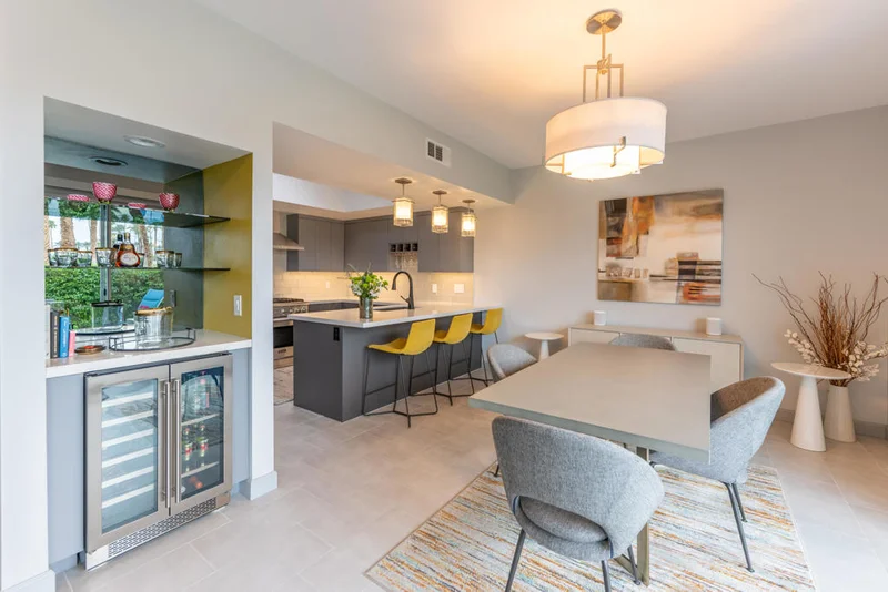 This special property is the only 4 Bedroom, 3 Bath home currently on the market in Casa Dorado at Indian Wells. It has been thoughtfully updated with contemporary design elements, and double-pane windows installed throughout the home. The kitchen and bathrooms have been remodeled with new cabinetry, quartz counter tops, appliances, fixtures, thick-glass enclosed showers, and porcelain tile flooring. The kitchen is open to the dining area with adjacent bar alcove that has a combination wine cooler/beverage refrigerator. The primary bedroom has an oversized walk-in closet with custom-designed California cabinetry and hanging space. An enclosed side-courtyard has been uniquely designed with two storage spaces that could be used as a golf cart garage and/or workroom. The landscaping surrounding the property has been professionally designed with low maintenance desertscape plantings.Casa Dorado is a sprawling, low density community with 116 condominiums on 26 acres. The grounds consist of 4 small lakes, 4 short par-3 golf holes that meander throughout the community, 6 pools, 4 spas, 2 tennis courts, and a clubhouse for social activities. The architectural character of the single-story structures is classic mid-century styling. The flat roof-lines and floor to ceiling pictures windows allow for expansive greenbelts, lake, and mountain views.