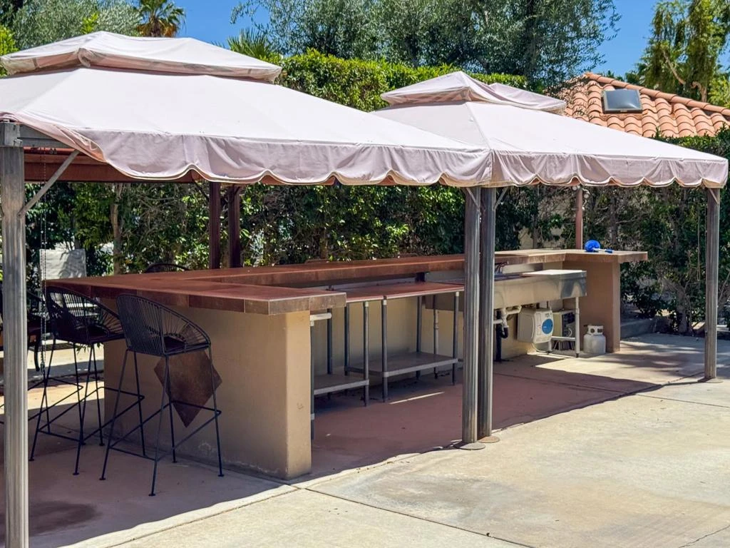 This oversized 3,920 sq. ft. luxury RV lot at Outdoor Resort Indio offers nearly twice the space of a standard lot and an unbeatable location just steps from the satellite pool, hot tub, sauna, and laundry. Designed for Class A motorcoach owners who enjoy the RV lifestyle, this unique property is full of delightful surprises--including an arched golf cart parking area and a secluded, hedge-enclosed 'room' perfect for outdoor dining or private entertaining. A small hidden grass lawn offers a space for pets or future personalization, while two sun shelters shade the expansive stainless kitchen area. Additional seating at the rear of the lot provides a peaceful retreat with a glimpse of the golf course--ideal for relaxing after a swim or soaking in the sun. With generous parking and resort-style amenities all around, this lot is both a spacious retreat and full of potential.‍Outdoor Resort Indio is a Class A only RV resort in Indio, CA.