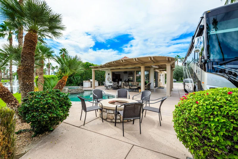 #53 DESERT SHORES RESORTLuxury Motorcoach Resort.Ownership requires Class A motorhome with minimum length of 36'Nice motorcoach property with RV parking space, a Coachside Villa on extra deep lot perched over a gorgeous lake with night-lighted fountains.Freshly painted inside and out this eastern backyard property includes a Coachside Villa with Great Room/Kitchen, Retreat with Bathroom and Walk-In Closet.Outside offers a pool, spa, natural gas firepit, expansive pergola with electric heaters, and a BBQ station.Association includes clubhouse, tennis, pickleball, fitness center, community pool & spa, social activities, 24 hour, guard gated with high-tech perimeter security, trailer storage area, doggie park, front yard landscape maintenance & brand new super-speed FIOS internet