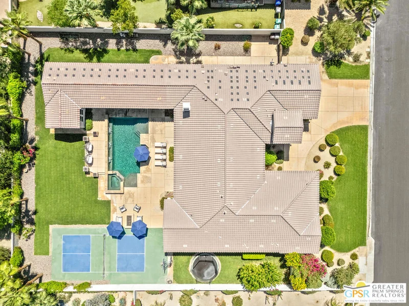 MADISON ESTATES luxury living! This impressive 5-bedroom, 5.5-bath residence spanning over 5,000 square feet offers 5 ensuite bedrooms with a detached 2-room casita in the mix. Open concept living with tall ceilings blends seamlessly to an expansive outdoor entertaining space designed for year-round enjoyment. A fabulous covered patio with fireplace, sparkling pool and spa, outdoor shower, and multiple dining and lounging areas are complemented by a huge outdoor kitchen with large island with built-in fire pit and dual TVs framing the space. Additional fire features frame the pool, misters keep things cool, and the view at night is spectacular. A private pickleball court completes the resort-style setting. Inside, the kitchen is the heart of the home, anchored by a substantial island with impressive seating capacity for gathering and entertaining. Custom cabinetry, a 5-burner gas cooktop, dual ovens, and refined finishes set the tone. The living area off the kitchen flows beautifully for entertaining, complemented by a formal dining room. Ensuite bedrooms enjoy a nice separation, with two lining each wing of the home, and the casita offering even more flexibility. Herringbone tile, custom woodwork, tall ceilings, and lovely finishes throughout add sophistication. The primary retreat opens to the pool area and features a private sitting area, spa-like bath with soaking tub and walk-in shower, and an impressive walk-in closet. Separate garages accommodate three cars in total. Madison Estates is a private gated enclave of just 55 homes on half-acre lots. Residents enjoy privacy, scale, and prestige along with proximity to the Empire Polo Club, PGA West, The Madison Club, and the valley's world-class golf, dining, and entertainment, all with low HOA fees and land you own. Enjoy it all!