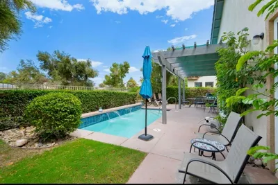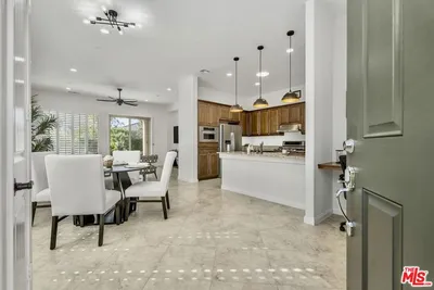 Single story home with rolling glass doors, oversized lot, and indoor outdoor living at Trilogy at The Polo Club in Indio.Located inside the gates of Trilogy at The Polo Club, this highly upgraded Monaco plan is designed to maximize indoor outdoor living with multiple spaces for entertaining and relaxing. Situated on an oversized homesite, the property offers exceptional curb appeal highlighted by a four panel glass garage door and an inviting front courtyard featuring an artistic teak wood accent wall.The kitchen opens seamlessly to a spacious great room and features quartz countertops, a seated bar, center island, breakfast nook, and upgraded stainless steel appliances, creating an ideal setting for both everyday living and entertaining. Wood tile flooring extends throughout the common areas and into the primary bedroom, adding warmth and continuity to the home.A large office or den is a standout feature, highlighted by a 12 foot rolling glass door that opens to a professionally designed rear yard and covered patio. Outdoor living is enhanced with pavers and a generous fire pit, offering an inviting space for gatherings and relaxed desert evenings.The primary suite is spacious and well appointed, featuring a dual sink vanity and walk in closet. Additional upgrades include upgraded fixtures and doors, designer ceiling fans, and custom window coverings, with thoughtful attention to detail throughout.The home also includes a solar system designed to offset the majority of the electric bill, supporting both comfort and efficiency. Located just a short distance to the Polo Club clubhouse and adjacent to a large greenbelt, the setting offers a balance of privacy, openness, and connection to the community.A Polo Club membership is available with a transfer fee. Membership provides access to the Polo Club, fitness center, pickleball and tennis courts, resort and lap pools, artisan studio, card room, banquet facilities, indoor golf simulator, billiards, and an active social calendar.This is a refined opportunity to enjoy casual elegance, modern design, and resort style living in one of Indio's most desirable gated communities.