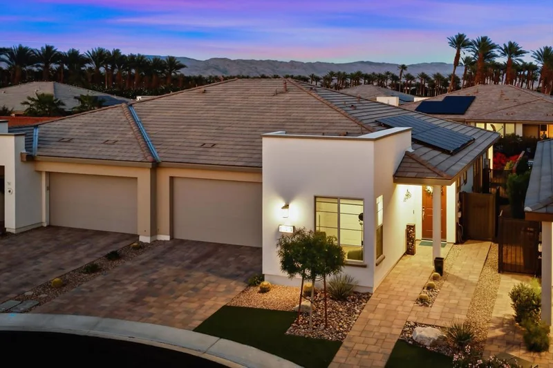 Premium Homesite on a Quiet Cul-De-Sac Overlooking Walking Path with Sunny East Facing Exposure. Light, Bright & Immaculate...This Practically NEW Pristine Clean Evia Model (2BR/2BA + Office/Hobby Room | 1,542 Sq. Ft.) is Move In Ready! Formerly a Designer Home, the materials and options have been carefully selected to create a warm, neutral palette ready for your own style and decor. The spacious great room features a large rolling wall of glass leading to the covered patio with built-in fire pit. The kitchen features high end appliances, upgraded cabinetry with soft-close doors and drawers and quartz countertops. The spacious primary bedroom with custom window coverings, walk-in closet and dual vanities is located opposite the guest bedroom and bath. Off the entry you'll find a cozy work station / hobby room with built-in desk and custom cabinetry. Whether you're looking for your forever home or desert vacation home, this cozy home checks all the boxes. The solar lease drastically offsets the elctric bill. Polo Club Membership is available to transfer. Schedule your tour today!