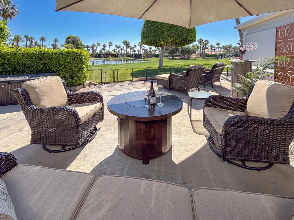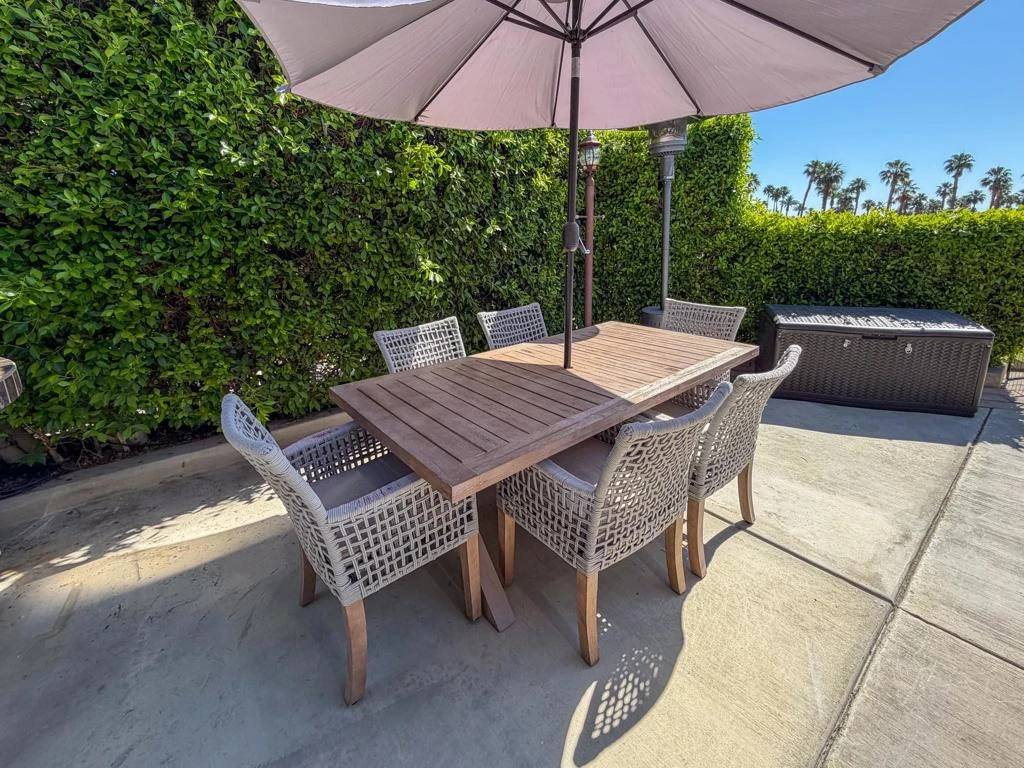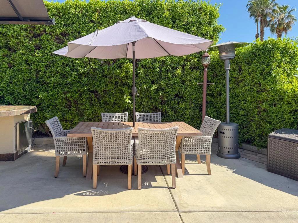 Welcome to Lot 331 at Outdoor Resort Indio, a beautifully positioned golf course lot offering expansive Phase Six fairway views with a stunning mountain backdrop and no tee box in sight. The rear of the lot faces east, providing comfortable morning sun and welcome afternoon shade from mature HOA-maintained trees. Framed by privacy hedges, this quiet location offers both scenery and seclusion while remaining conveniently near the resort's pet areas.Designed for entertaining and relaxed desert living, the large outdoor kitchen features hot water, dishwasher, mini fridge, BBQ, two-burner cooktop, and sleek stainless steel cabinetry and doors. The lot is being offered furnished and includes a fire table with three matching chairs, loveseat, ottoman, and end table, along with an outdoor dining table with umbrella and eight chairs. A cantilever umbrella, mushroom heater, and custom covers for all furniture enhance comfort and protection.Practical features include mid-lot hookups, three storage bins, hedge lighting stored in the storage box, and the dog fence that will remain. An included golf cart adds convenience for getting around this premier Class A motorcoach resort. Lot 331 combines location, functionality, privacy, and panoramic golf course and mountain views -- all within the sought-after community of Outdoor Resort Indio.Outdoor Resort Indio is a class A only motorcoach resort.