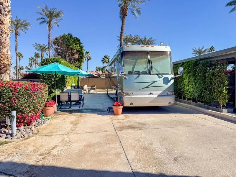 Discover your place retreat at this west-facing luxury RV lot in the prestigious Outdoor Resort Indio. Nestled in a quiet and private neighborhood, this perimeter lot offers stunning sunsets, framed by lush hedges on both sides creating your own personal space. The lot is partially furnished with outdoor furniture, umbrellas, and a storage box, making it ready for relaxation or entertaining.The well-equipped outdoor kitchen includes a BBQ, side burner, refrigerator, hot plate, double stainless sink with garbage disposal, and hot water. Two pedestal lights illuminate the patio, creating a welcoming ambiance for evening gatherings. This peaceful lot is an ideal haven for your luxury RV lifestyle.‍Outdoor Resort Indio is a class A motorcoach community only. Gated.