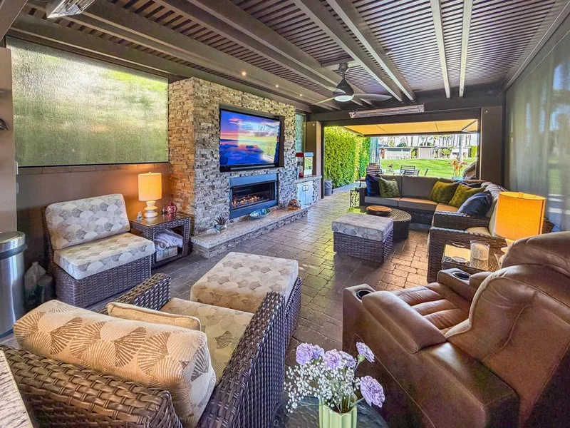 Outdoor Resort Indio is a Class A Motorcoach resort. RV Lot #15 at Outdoor Resort Indio is a high-end golf course view pergola lot offering wonderful sunrises and refined outdoor living in one of ORI's most desirable settings. Designed to park a 45-foot coach, two cars, and a golf cart, this spacious lot blends functionality with upscale finishes.A long pergola features privacy glass along one wall, wraparound electric shades, three radiant heaters, two fans, and layered lighting--including LED kitchen lights, ambient rope lighting around the bar, and pendant fixtures--creating a warm, elegant atmosphere day or night. The expansive granite-countered kitchen includes a large island with built-in bar seating and premium amenities such as a two-drawer refrigerator, two-drawer dishwasher, icemaker, warming drawer, oven, five-burner electric cooktop, dual wine cooler sections, built-in microwave, and abundant stainless storage.A custom-built entertainment center with propane fireplace and protective Shutterwise metal roll-up shutter anchors the living area. At the rear, an 11-foot dimmable, lighted extending awning covers the back patio, complemented by two propane heaters and an outdoor dining table for six near the fireplace--perfect for enjoying early morning sun or relaxed evenings overlooking the golf course. With a built-in remote-controlled propane fire pit and thoughtfully furnished seating areas, Lot #15 delivers elevated luxury in a premier Class A motorcoach setting.