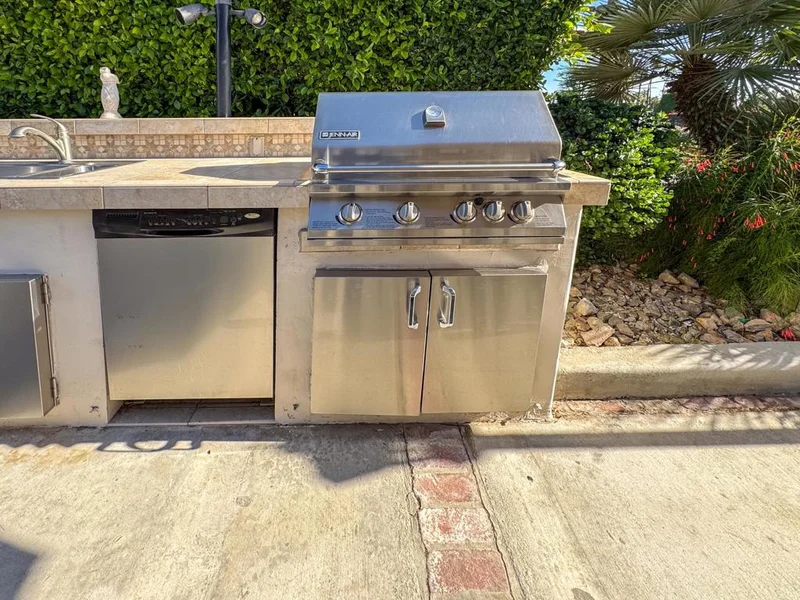 Outdoor Resort Indio is a Class A Motorcoach resort. This is an RV lot. This beautiful south-facing golf course lot that has been well-kept and offers breathtaking views of the lake, fountain, and mountains, creating a serene and private retreat with lush hedges on both sides. Ideally located on a wide street for easy backing in, this lot allows you to step directly onto the tee for a morning round or an evening stroll. Thoughtful landscaping, including a charming citrus tree and an enclosed seating area, provides the perfect setting for entertaining or relaxing under the stars with bar seating and ambient perimeter lighting enhancing the atmosphere.The well-equipped large outdoor kitchen features tiled counters with accent lighting and appliances, including a built-in BBQ, cooktop, oven, fridge, ice maker, dishwasher, and a brand-new water heater. Ample space for a car and golf cart, along with mid-lot hookups, adds convenience and functionality. This semi-furnished lot is move-in ready, offering the perfect foundation for your dream pergola and a luxurious RV lifestyle filled with comfort and unforgettable moments.