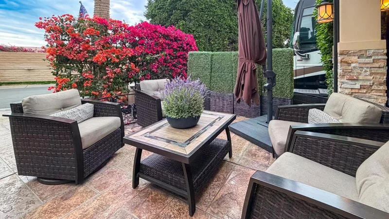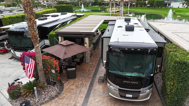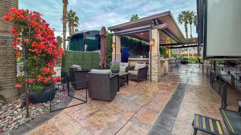 Outdoor Resort Indio is a Class A Motorcoach resort. This is an RV lot. Lot #239 at Outdoor Resort Indio is a thoughtfully designed RV resort lot offering privacy, golf course, lake, and mountain views, along with inviting outdoor living. A five-year-old, well-anchored roof covers a beautiful L-shaped Alumawood pergola with stacked stone pillars, enhanced by abundant recessed lighting and a generous front covered area--perfect for storing chairs and cushions during the rare desert rain.The outdoor kitchen includes granite countertops with a wrap-around bar, all-stainless appliances, a built-in Blaze BBQ and refrigerator, oven, dishwasher, hot water, garbage disposal, and ample storage. A TV on a Televator swivels for ideal viewing, while three electric screens, two ceiling fans, and three ceiling heaters provide year-round comfort.The stamped and sealed concrete RV pad and kitchen area create a clean, finished look. Enjoy golf course, lake, fountain, and bridge views with stunning sunsets, all without walk-by golfers or motorcoaches across the street. A private front seating area with bougainvillea hedges--maintained by the HOA--offers a peaceful spot for morning coffee. Partially furnished and pet-friendly, with a dog area directly across the lot, this is a quiet, private setting ideal for relaxed resort living.