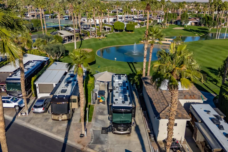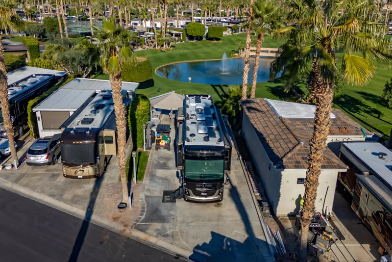250 Tee Street- Outdoor Resort Indio | Located along the golf course on Tee Street at Outdoor Resort Indio, this north-facing lot offers open views of the lake, arched bridge, fairways, and surrounding mountains in a peaceful and well-positioned setting within the resort. The lot is a short walk to the pickleball and tennis courts and the newly remodeled clubhouse, providing convenient access to amenities while maintaining a comfortable sense of separation.The outdoor living space features an expanded paver layout with multiple defined seating areas, including a dining space and a separate conversation area arranged in soft, neutral finishes. A two-part outdoor kitchen anchors the space and includes a built-in TV, BBQ, large sink, two under-counter refrigerators, two-burner cooktop, hot water heater, storage, and exterior lighting. A sun structure provides shade during warmer parts of the day, and the north-facing orientation allows for consistent natural light without direct afternoon sun.The sellers previously worked with Unique Islands to explore a future build-out for the lot, and concept images are available to help illustrate how a casita, shade structures, and expanded outdoor living areas could be integrated into the space.This property is intended for Class A motorcoach use only. Occupancy and use are subject to HOA rules and approval.Concept images are provided for inspiration and illustrative purposes.