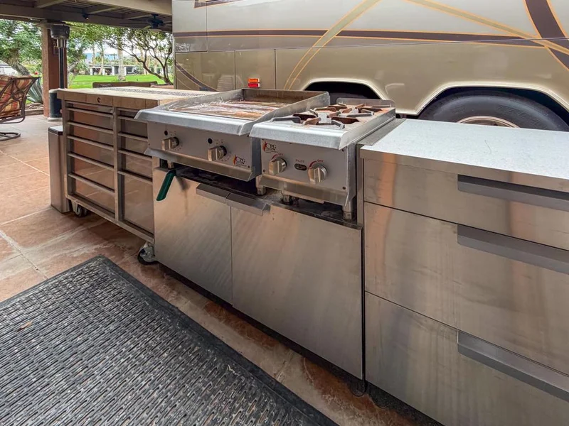 Enjoy relaxed resort living on this well-appointed lot at Outdoor Resort Indio, featuring beautiful evening views of the lake and waterfall directly in front. The lot offers excellent privacy with full-height hedges and mature landscaping and is positioned away from golfer traffic, allowing peaceful enjoyment of the golf course. The quiet location includes parking for two vehicles plus a golf cart.An L-shaped wood pergola with a metal-skinned roof anchors the outdoor living space, complemented by all-tile RV pad and flooring, LED lighting, two ceiling fans, and electric sun shades with remote control. The outdoor kitchen includes a cooktop, BBQ, dishwasher, oven, refrigerator, sink with hot water and garbage disposal, plus a rolling island with commercial burners and flat-top griddle.The lot is furnished with a wicker sofa set and end tables, a round dining table with four cushioned chairs, and a round fire table with cushioned seating and ottomans. A TV is located in the living area under the pergola, and a mushroom heater adds comfort in cooler evenings. A washer and dryer and rolling stainless steel tool cart add convenience, and the golf cart is negotiable. Washer and dryer utility hookups are in ($2,000 value) ready for upgrade with HOA approvalThis private, quiet lot offers exceptional water views and inviting outdoor living at one of the desert's premier Class A motorcoach resorts.ORI is a class A motorcoach community.