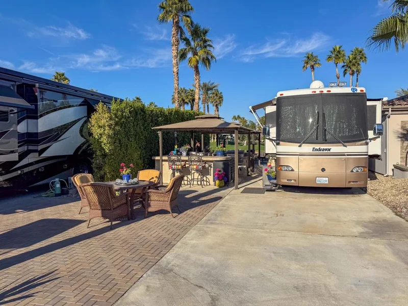 If you love pickleball, golf, and resort-style living, this centrally located luxury RV lot is the perfect choice! Situated on the 11th hole with park-like golf course views, this lot offers a front-row seat to activities and events while maintaining privacy with rarely a golfer passing by. Just steps from ORI's six pickleball courts, the clubhouse, cafe, and resort amenities, this lot keeps you close to the action while ensuring a peaceful retreat. A wider street makes pulling in easy, and plenty of parking space accommodates your RV, car, and golf cart effortlessly.Designed for both entertaining and relaxation, the well-maintained outdoor kitchen features a built-in grill, bar, and ample storage, complemented by two Sunbrella sun covers with ceiling fans for all-day comfort. The spacious back area with extended pavers provides the perfect setting to unwind. With updated electrical, beautiful views from both ends, and a peaceful atmosphere, this lot is a rare find for those who want the best of privacy, convenience, and luxury RV living.Outdoor Resort Indio is a class A RV resort.
