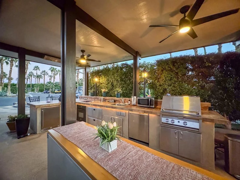 RV lot #94 offers a serene and private retreat tucked near the HOA office, where tranquil water features create a relaxing ambient backdrop. Ideally located close to a satellite pool and just a short walk to the clubhouse, the property combines convenience with calm resort living. A custom, fully permitted, one-year-old Alumawood pergola with a solid insulated roof and baked-on enamel finish provides lasting elegance and comfort, featuring 10-foot ceilings, four ceiling fans, and two ceiling heaters for effortless enjoyment throughout the season.Under the pergola, a large outdoor kitchen with tile counters and new stainless appliances--including a refrigerator, oven, cooktop BBQ, dishwasher, and microwave--sets the stage for entertaining or relaxing in style. The space also includes rolling island storage, three large storage cabinets, and a fire table for cozy evenings under the desert sky. With manual screens at the front and back, ample lighting, and a surfaced RV pad, this private lot blends beauty, comfort, and functionality. Enjoy stunning sunsets, soothing fountain sounds, and a peaceful atmosphere that make this one of the most desirable escapes in Outdoor Resort Indio.‍ This lot has a recent survey.Outdoor Resort Indio is a Class A only motorcoach resort.