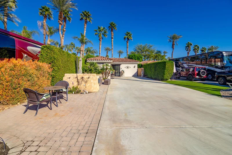 Lot 30 located in Motorcoach Country Club is a thoughtfully developed privacy lot, offering a functional layout designed for comfortable day-to-day living with strong privacy. The lot features a detached casita, tile roof shade structure, expanded front paver parking, and a fully enclosed private yard.The front of the lot includes expanded pavers providing additional parking and golf cart space, along with multiple seating and conversation areas that create a welcoming and versatile outdoor entry.The tile-roofed shade structure functions as an enclosed living space and includes a seating area with fireplace, kitchen, and a Murphy bed for guests, making it a flexible extension of the coach for everyday use or hosting overnight visitors.The detached casita has been remodeled to include a spa-style bathroom with a nicely sized shower, ample counter space, and a full-size washer and dryer with dedicated folding counters, offering excellent functionality for extended stays.Between the casita and shade structure is a built-in outdoor kitchen and BBQ island, with an awning extending from the shade structure to provide shade over the cooking area and create a natural indoor/outdoor connection.The backyard is fully enclosed with tall privacy walls, creating a cozy and intimate outdoor space. The enclosed layout offers a quiet, private setting that works well for relaxing outdoors, spending time with pets, or enjoying peaceful evenings.Lot 30 is well suited for buyers seeking a private, low-maintenance lot with a comfortable indoor/outdoor flow in a convenient Avenue 48 location.Motorcoach Country Club exclusively accommodates Class A motorhomes from 30' to 45'. Due to zoning, on-site properties are not considered dwellings, and overnight stays inside them are not allowed. MCC's annual Food & Beverage minimum is $2,080.