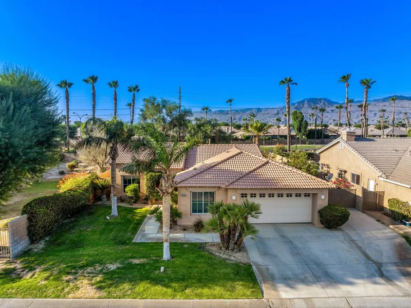 The ultimate in desert living begins here within the gates of Monticello ll in Indio. This beautifully maintained home features 3 bedrooms including primary suite, 2 baths, dining area, light and bright kitchen with Morning Room and South-facing entertainment patio. The large, custom-designedpool with spa and spillway is perfectly positioned to enjoy the view of the distant Mountains and palm trees that surround the area. Upgrades withinthe home include 18-inch diagonal ceramic floor tile, Plantation Shutter Doors in kitchen and primary, custom blinds, granite countertops andstainless appliances. A newer heat pump and AC system offers comfort and efficiency, plus an attic fan that activates during extreme heat to assistin whole-home cooling and lowering power usage. Pride of ownership is evident throughout this 1,500 sq. ft. home that boasts style, comfort, functionality and resort style living.